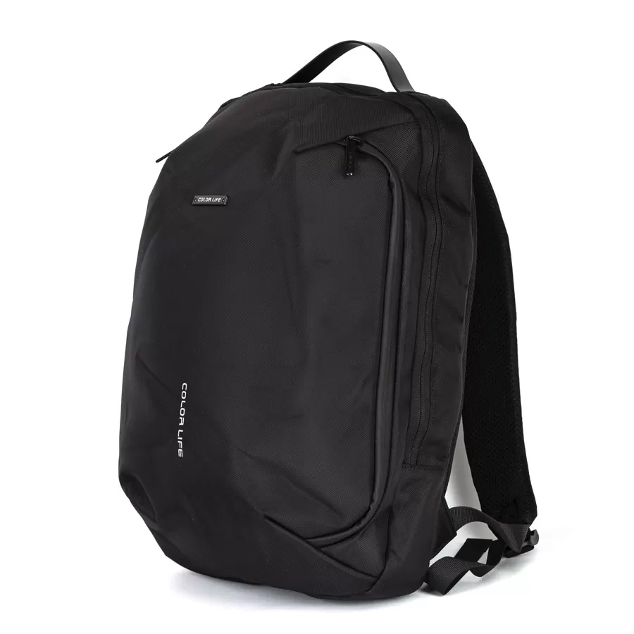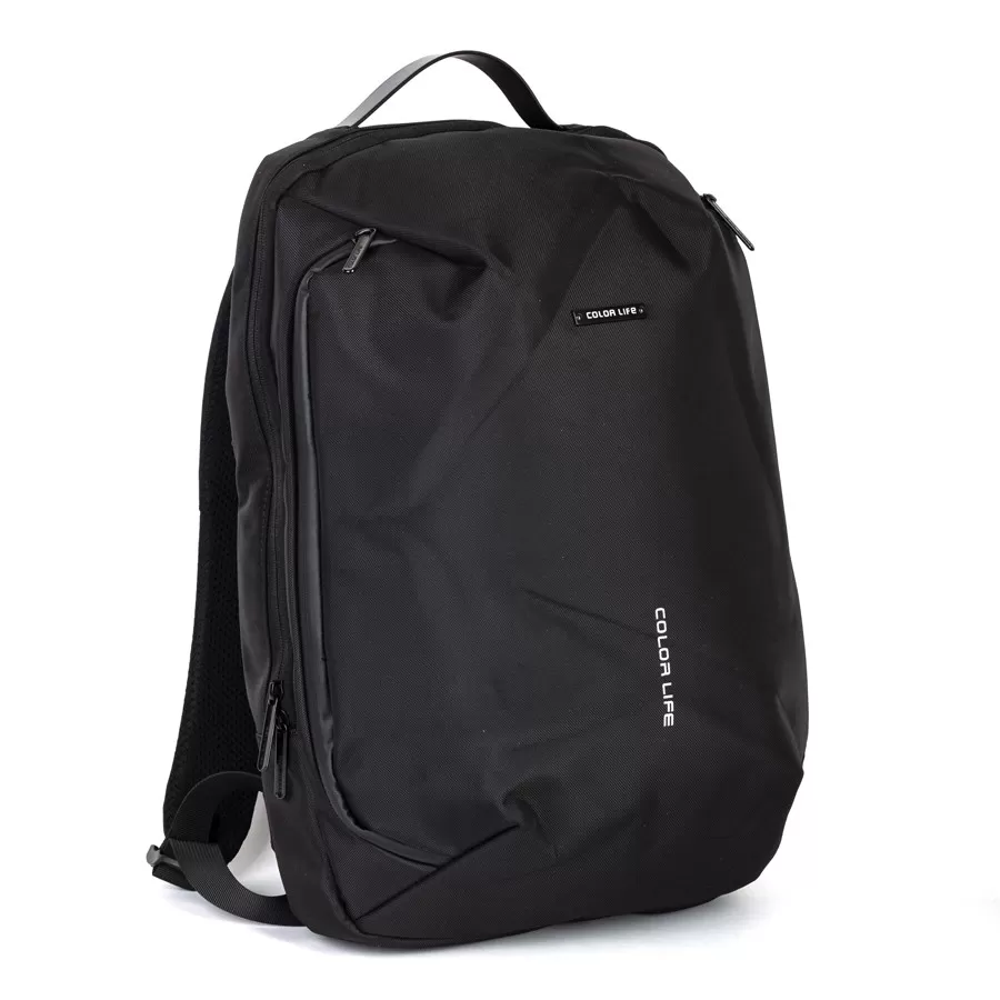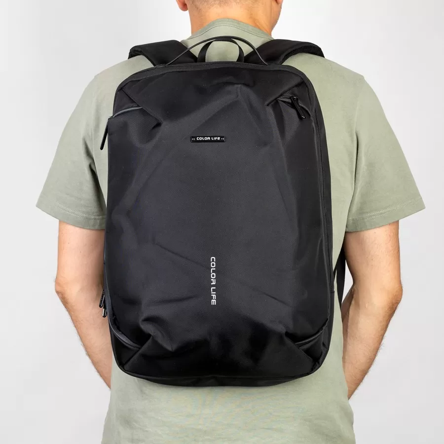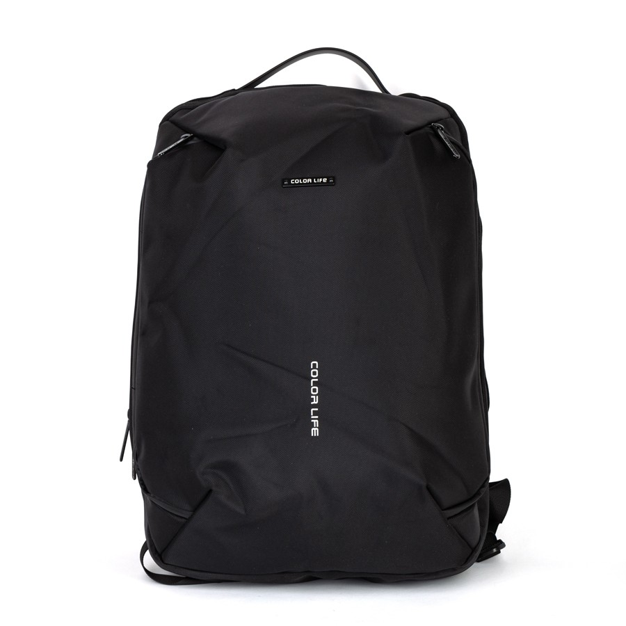 Рюкзак Color life из текстиля черного цвета. Имеет текстильные плечевые лямки и 2 вшитые ручки: из текстиля и резины. Есть дышащая спинка. Внутри основного отделения есть 3 отдела, в т.ч. для ноутбука и 2 кармашка для мелких вещей. На лицевой стороне 2 кармана на молнии. На спинке есть ручка для использования рюкзака в качестве щита