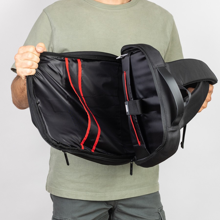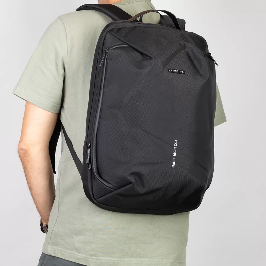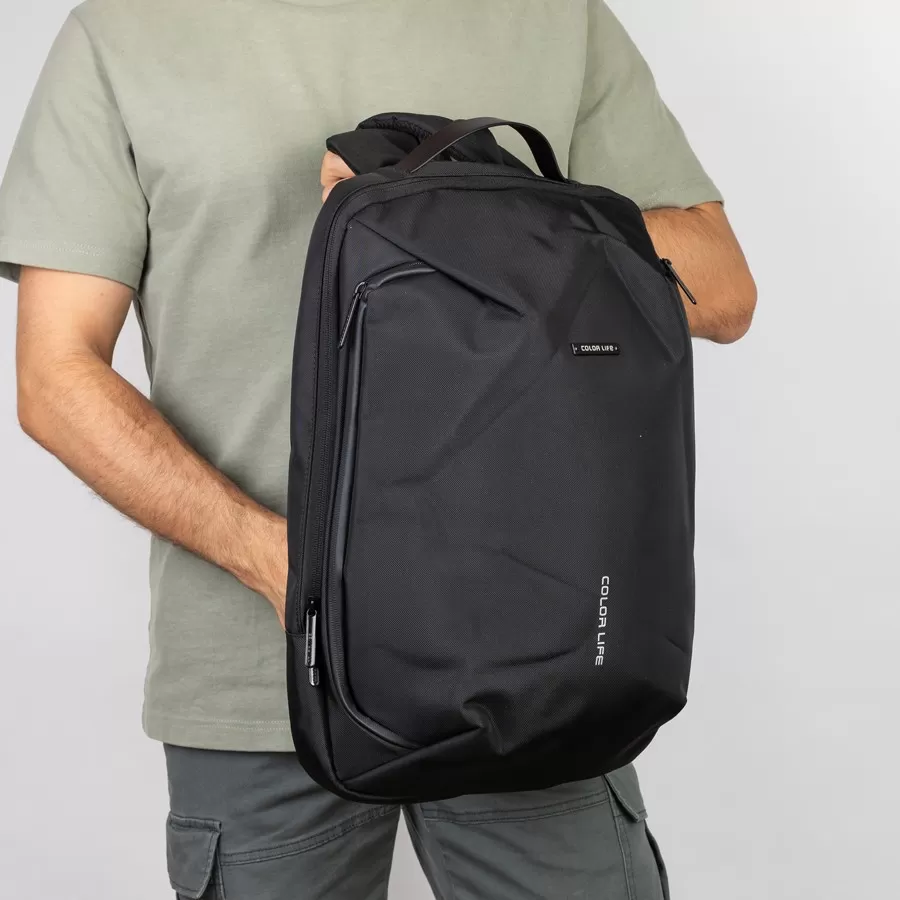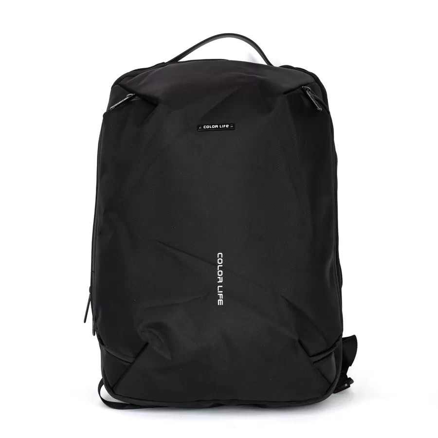 Рюкзак Color life из текстиля черного цвета. Имеет текстильные плечевые лямки и 2 вшитые ручки: из текстиля и резины. Есть дышащая спинка. Внутри основного отделения есть 3 отдела, в т.ч. для ноутбука и 2 кармашка для мелких вещей. На лицевой стороне 2 кармана на молнии. На спинке есть ручка для использования рюкзака в качестве щита
