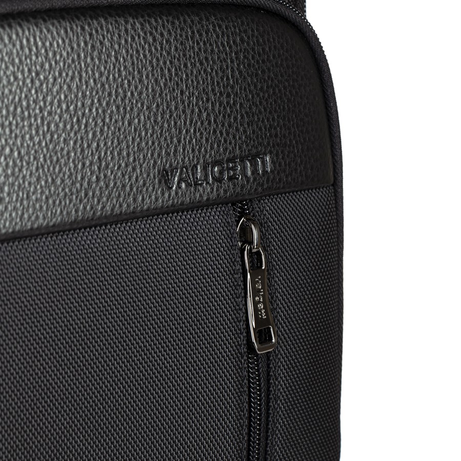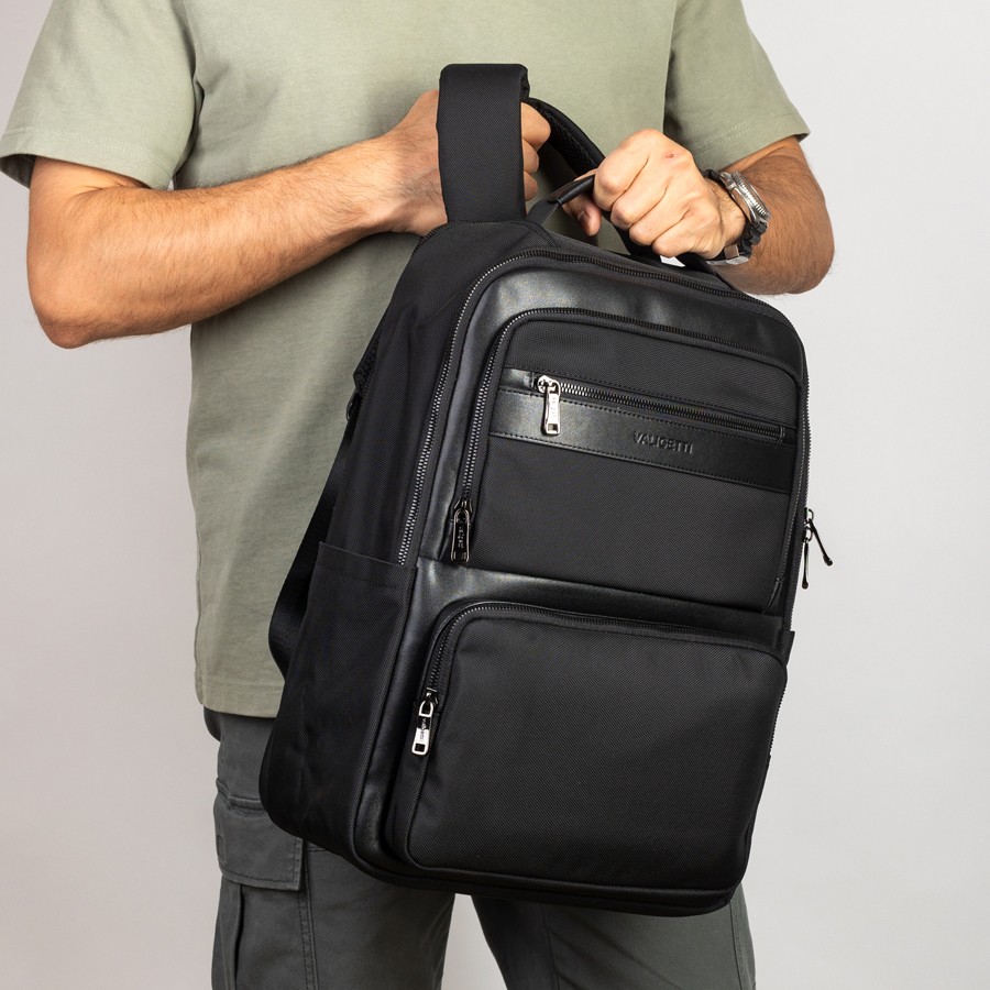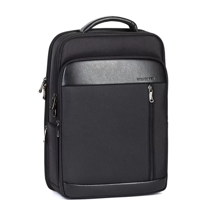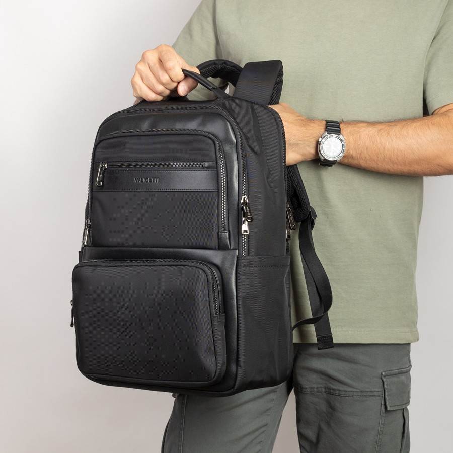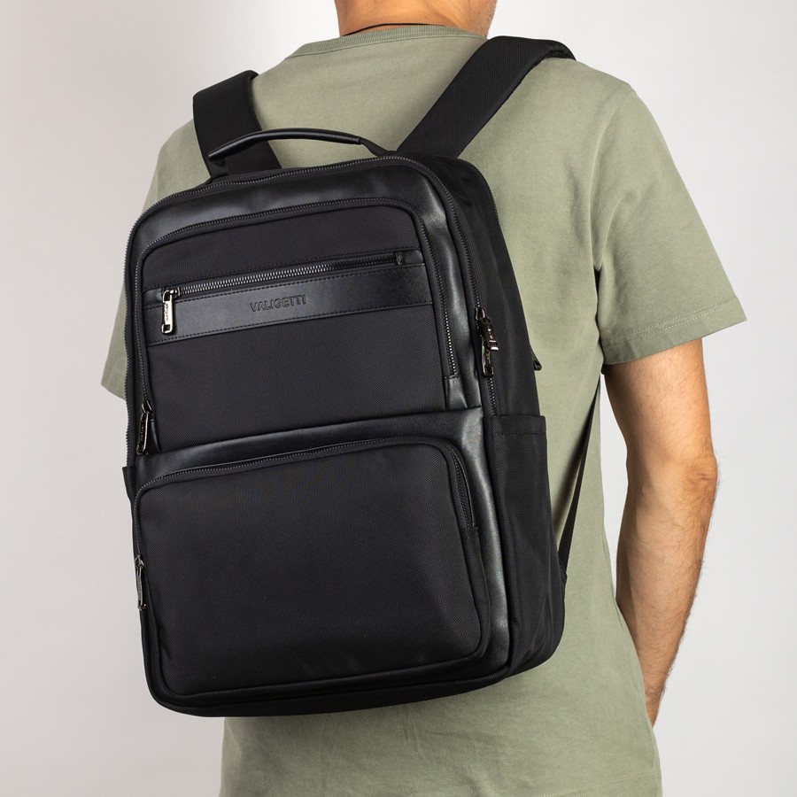 Cтильный рюкзак бренда Valigetti из натуральной кожи и текстиля черного цвета. Имеет текстильные плечевые лямки и вшитую кожаную ручку. Обладает рельефной спинкой, повторяющую форму тела. Прошит фирменной подкладочной тканью. Внутри основного отделения есть большой отсек и карман на молнии. Есть дополнительное отделение сзади, в т.ч. с отсеком для ноутбука. На лицевой стороне есть небольшое отделение и карман на молнии. Сбоку двойной открытый кармашек. Так есть USB-вход