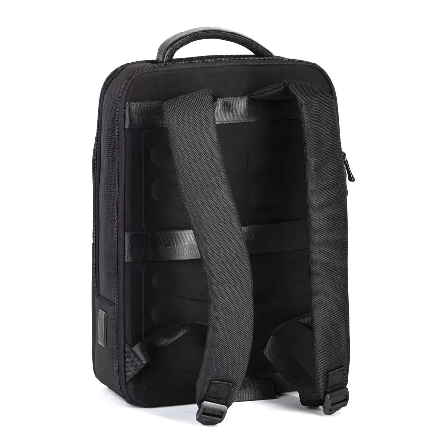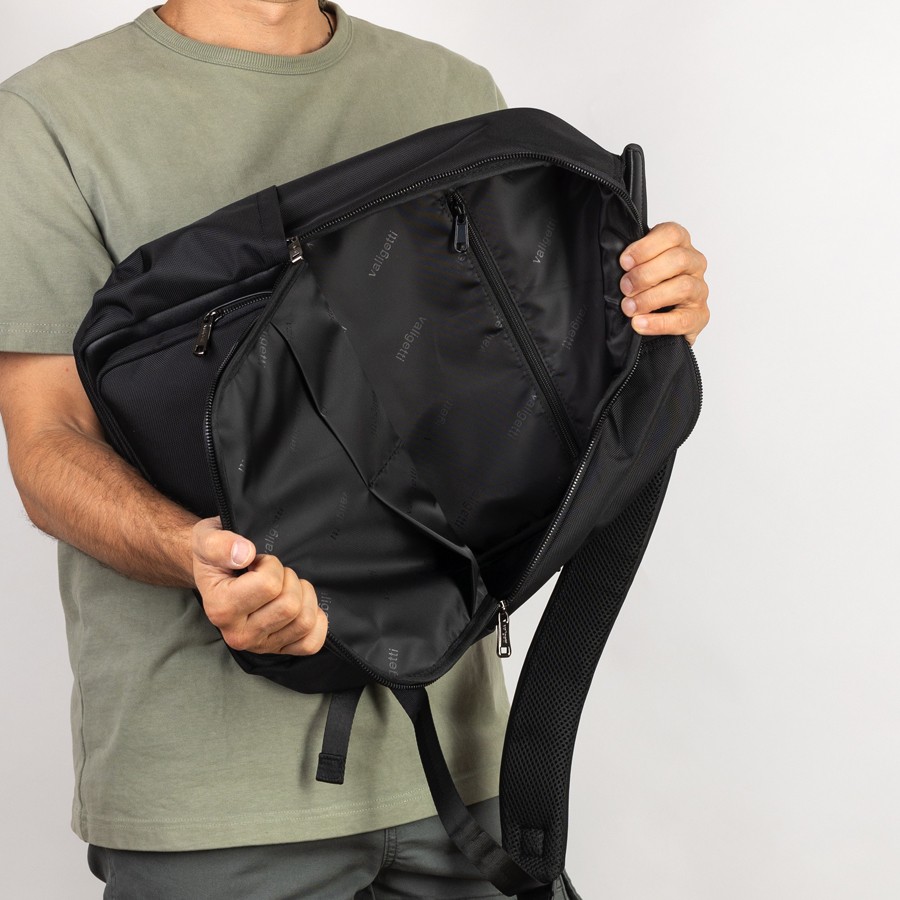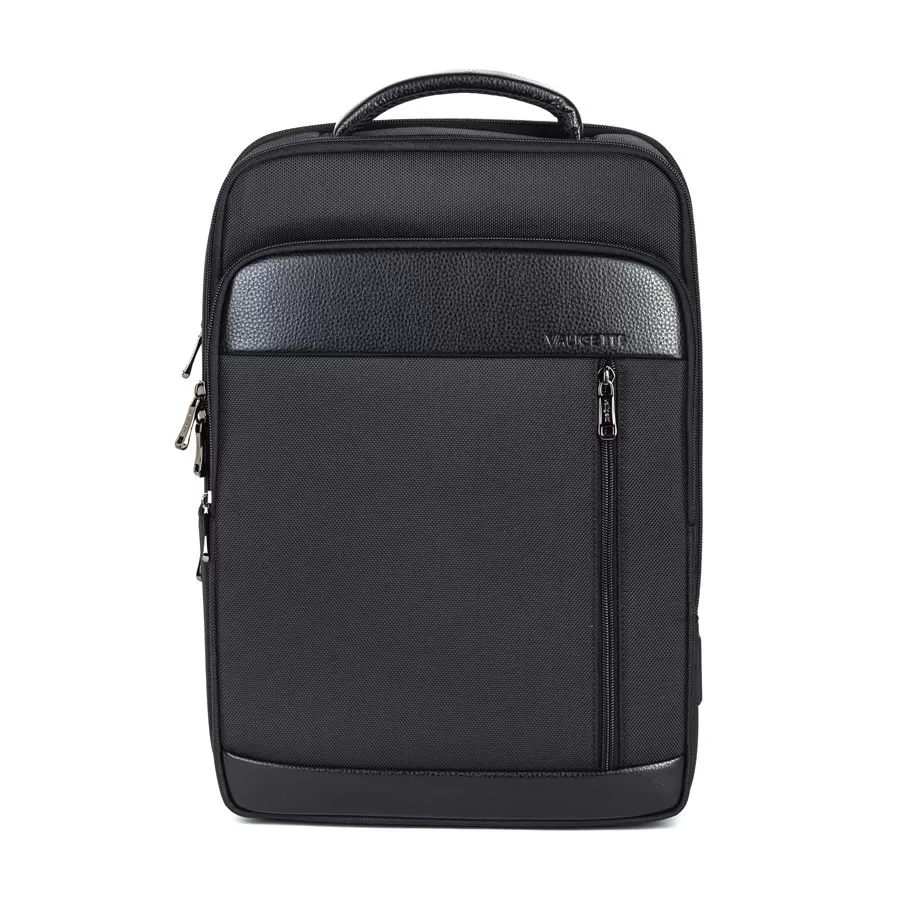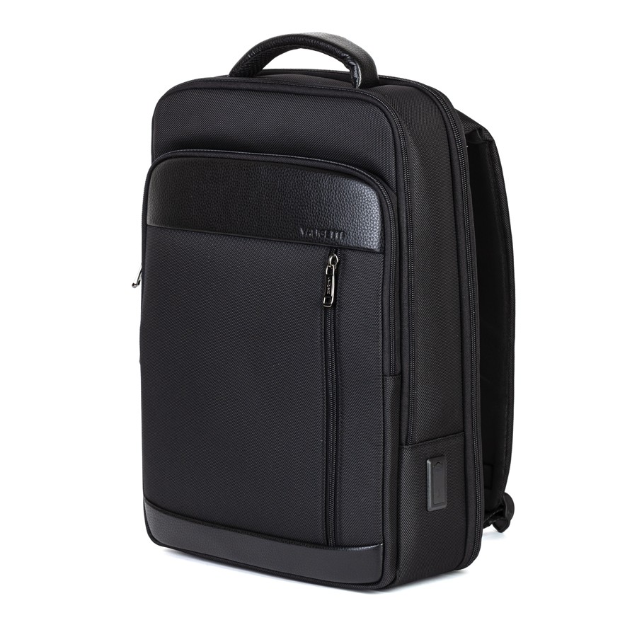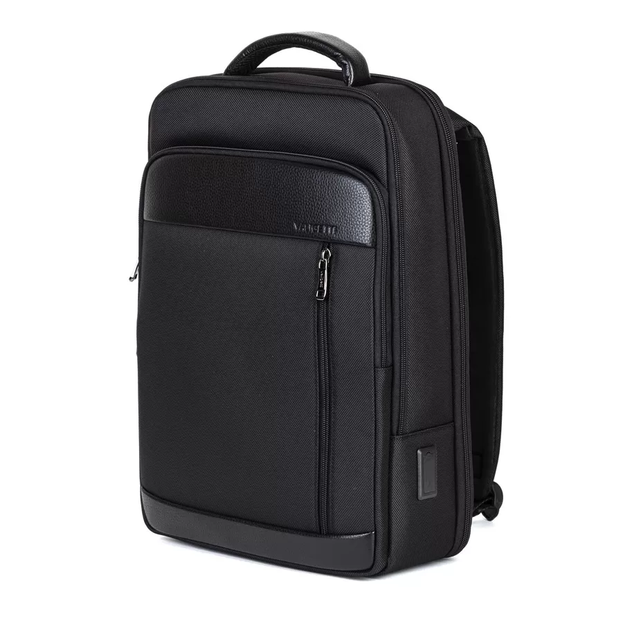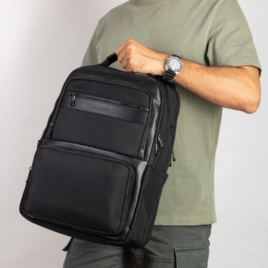 Cтильный рюкзак бренда Valigetti из натуральной кожи и текстиля черного цвета. Имеет текстильные плечевые лямки и вшитую кожаную ручку. Обладает рельефной спинкой, повторяющую форму тела. Прошит фирменной подкладочной тканью. Внутри основного отделения есть большой отсек и карман на молнии. Есть дополнительное отделение сзади, в т.ч. с отсеком для ноутбука. На лицевой стороне есть небольшое отделение и карман на молнии. Сбоку двойной открытый кармашек. Так есть USB-вход