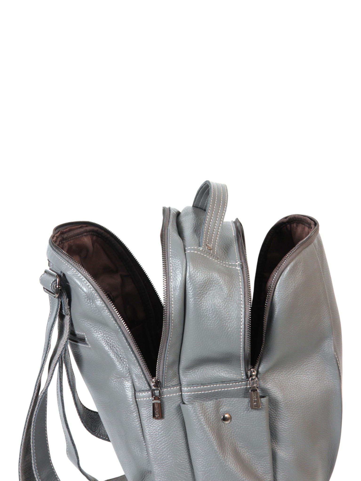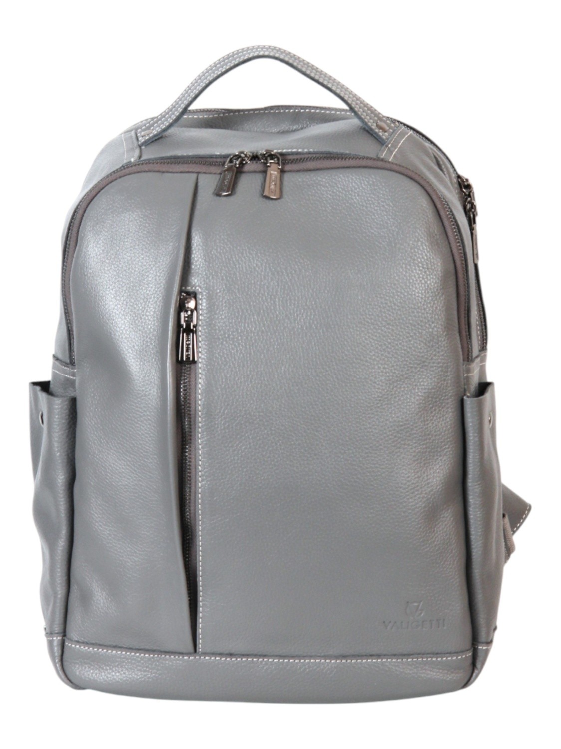 Женский рюкзак бренда Valigetti из натуральной кожи серого цвета с зернистой структурой. Прошит фирменной подкладочной тканью. Имеет плечевые лямки и пришитую кожаную ручку. У данной модели есть 2 больших отделения, потайной кармашек и отделение для документов. Вмещает формат А4. Так же сзади и спереди есть по одному кармашку быстрого доступа на молнии.