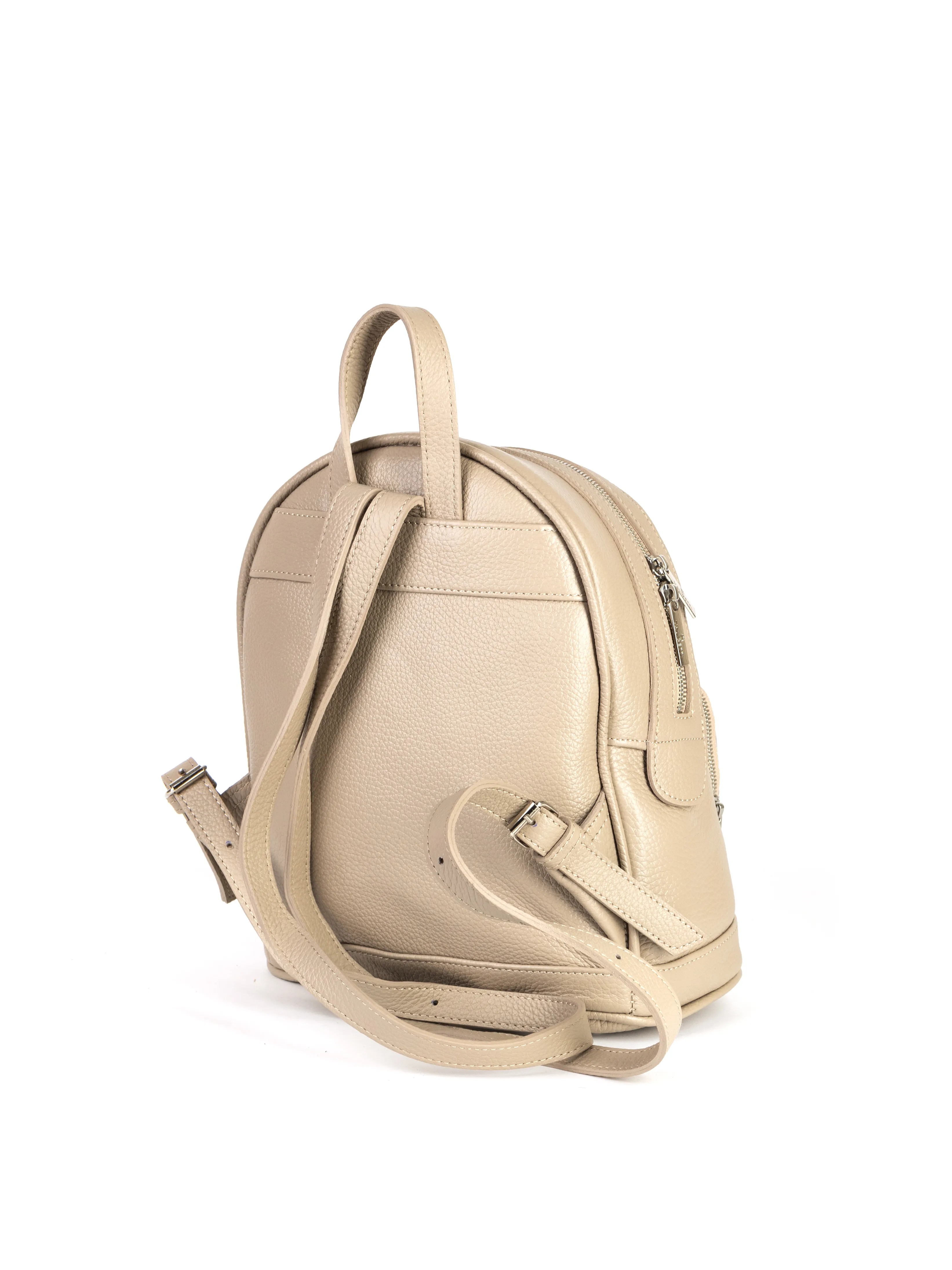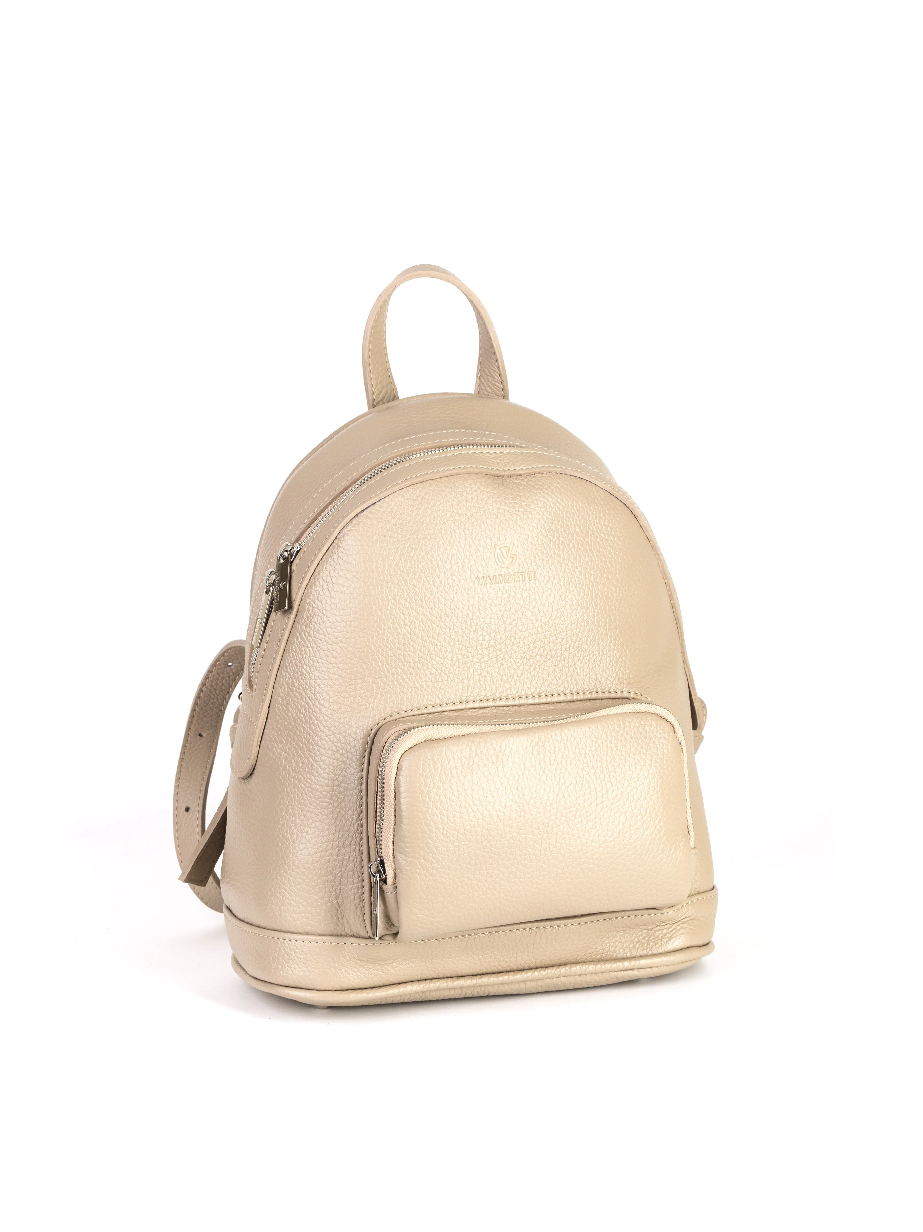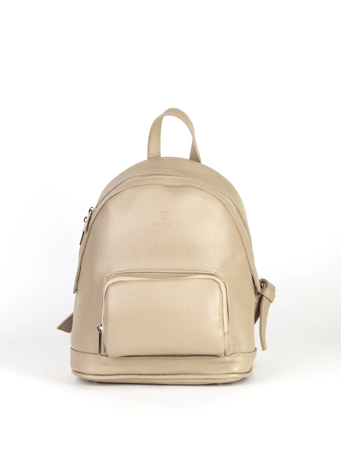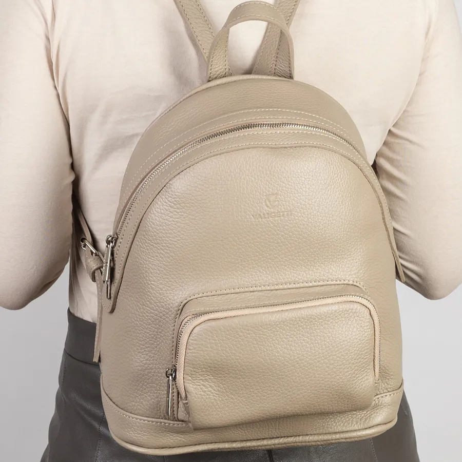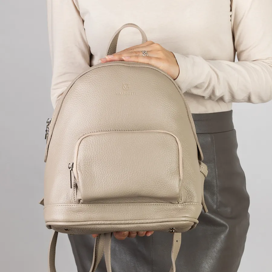 Женская рюкзак бренда Valigetti из натуральной кожи с зернистой структурой. Прошита фирменной подкладочной тканью.. Имеет кожаные плечевые лямки и вшитую ручку. Внутри основного отделения есть карман на молнии и кармашек для мелких вещей. На лицевой стороне есть карман на молнии. Снизу есть металлические ножки, чтобы можно было поставить сумку на твердую поверхность