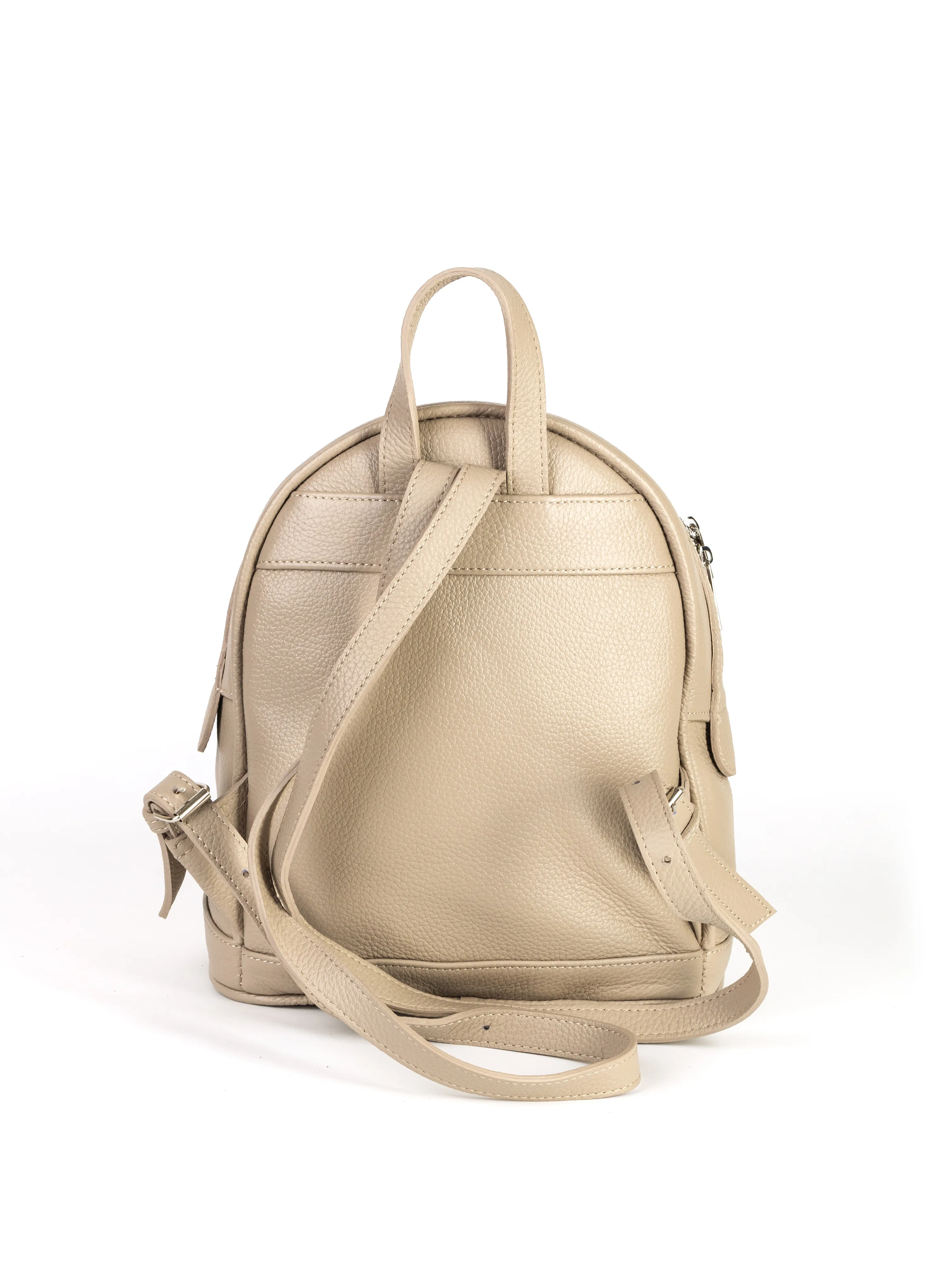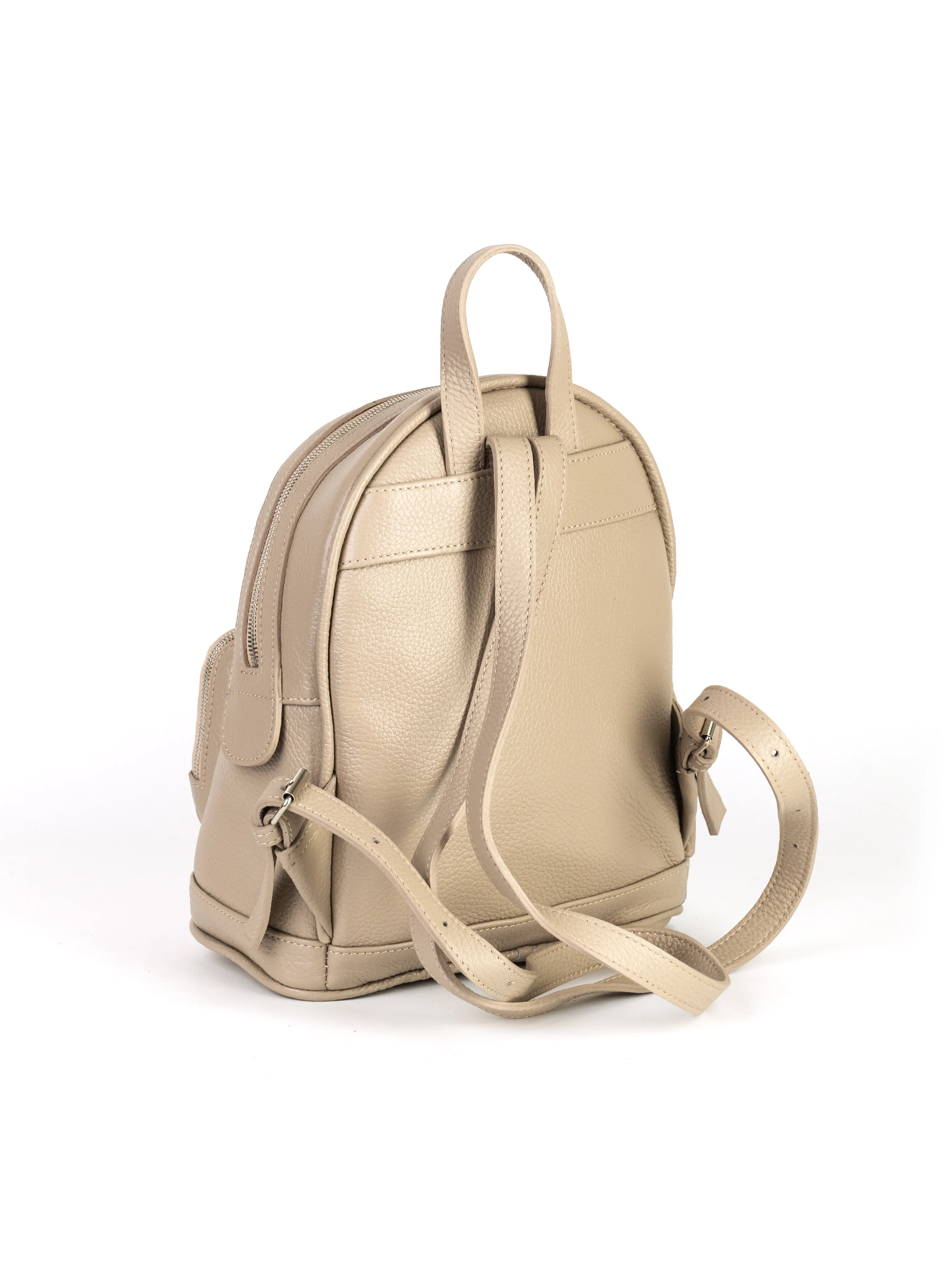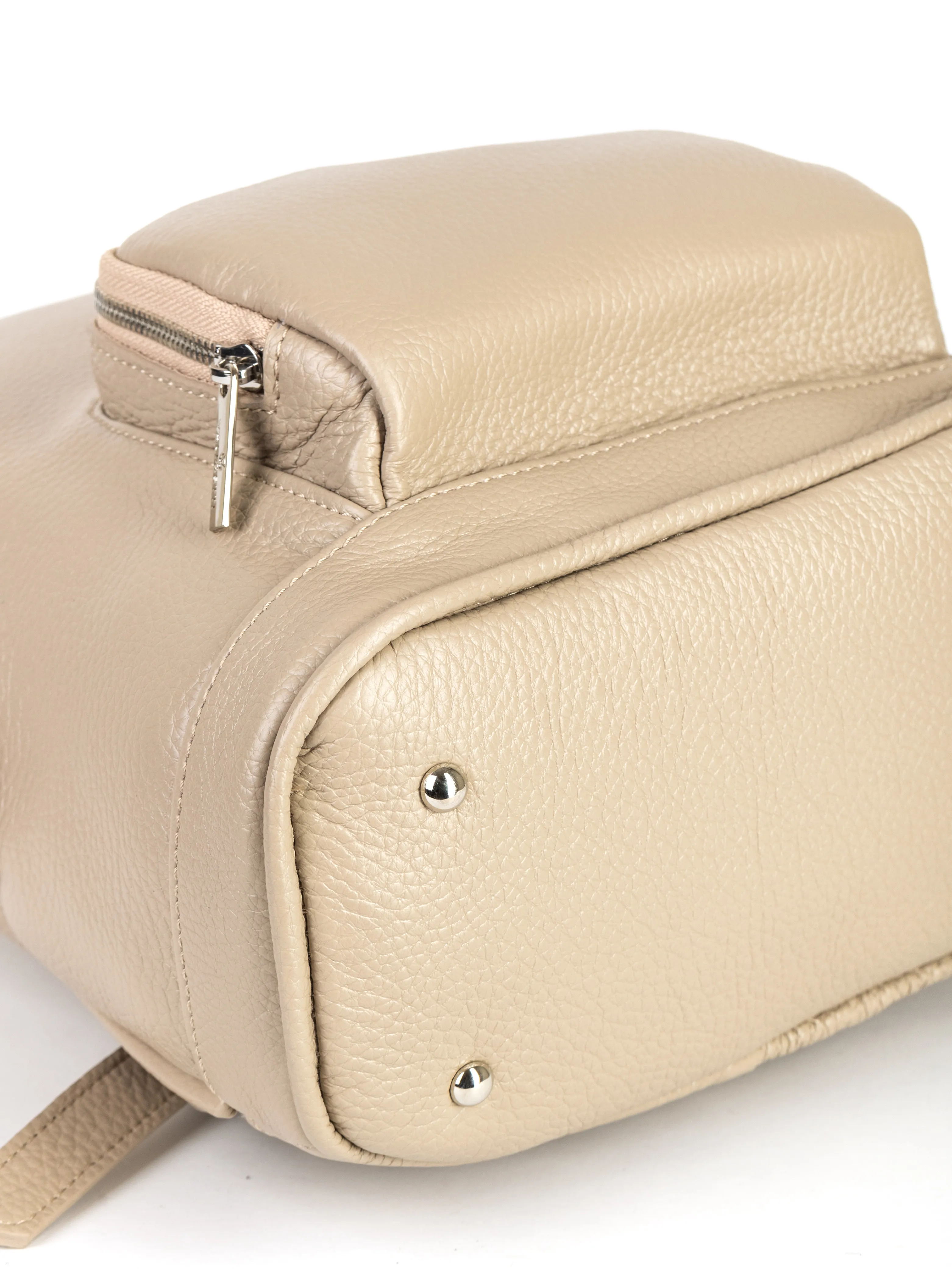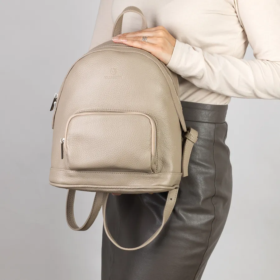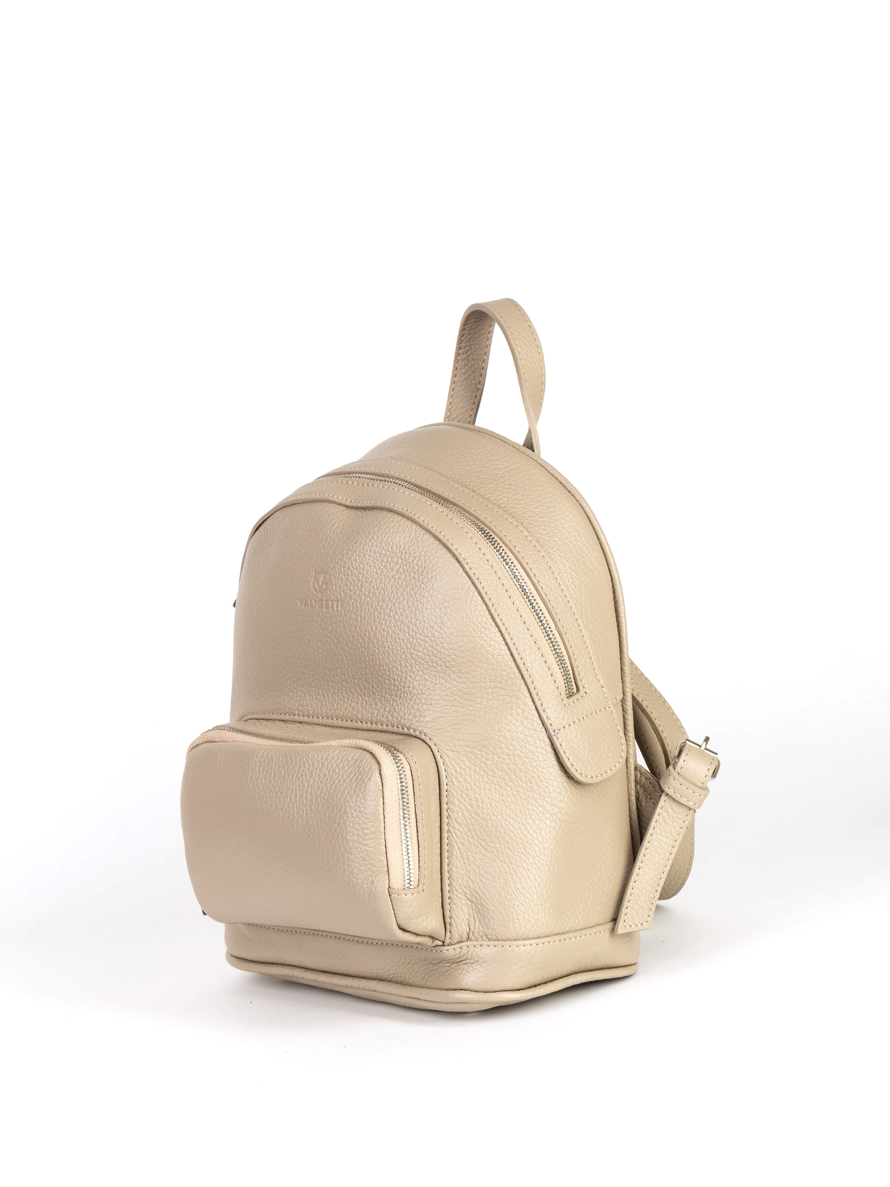 Женская рюкзак бренда Valigetti из натуральной кожи с зернистой структурой. Прошита фирменной подкладочной тканью.. Имеет кожаные плечевые лямки и вшитую ручку. Внутри основного отделения есть карман на молнии и кармашек для мелких вещей. На лицевой стороне есть карман на молнии. Снизу есть металлические ножки, чтобы можно было поставить сумку на твердую поверхность