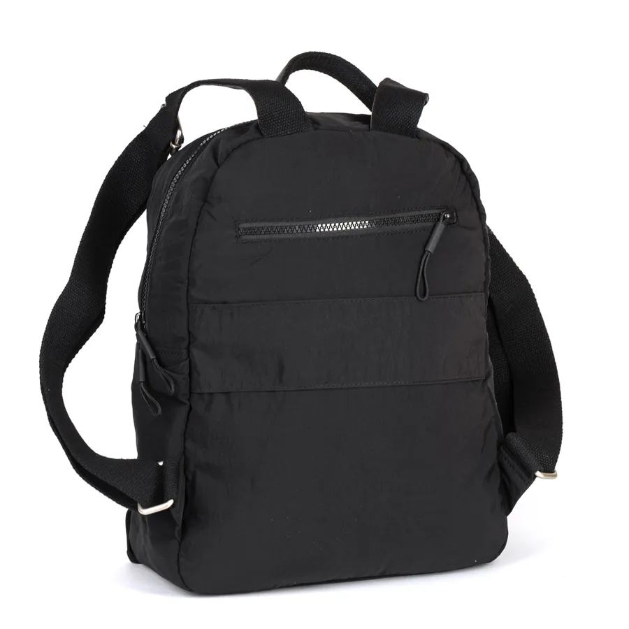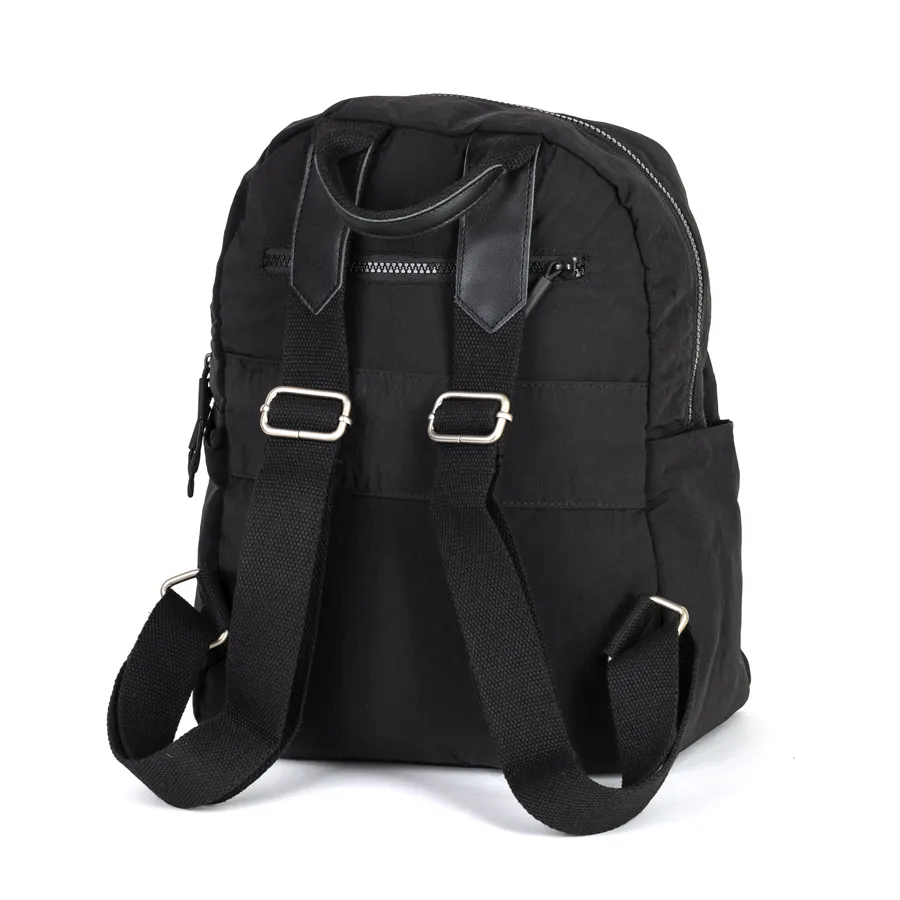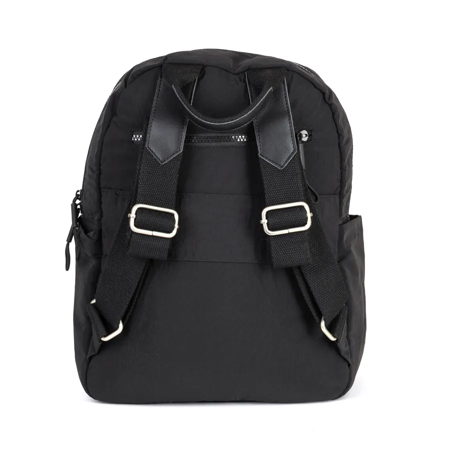Рюкзак бренда Valigetti из текстиля черного цвета. Имеет плечевые лямки и вшитую текстильную ручку. Внутри основного отделения есть карман на молнии и открытый кармашек. На лицевой стороне есть на молнии. По бокам 2 открытых сетчатых кармашка. С задней стороны есть карман на молнии. С задней стороны есть ремень фиксации на ручке чемодана