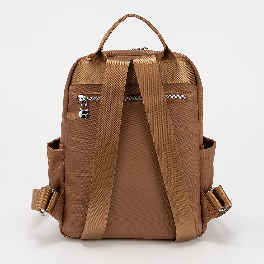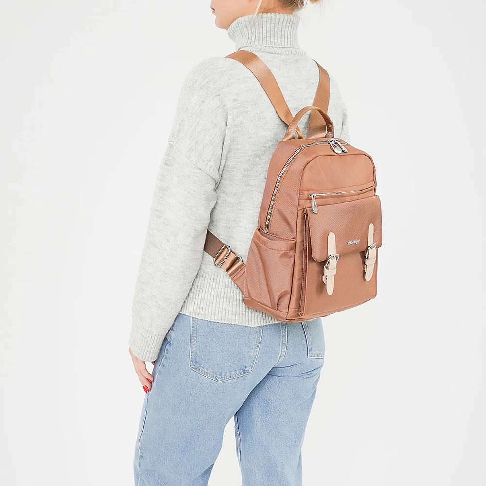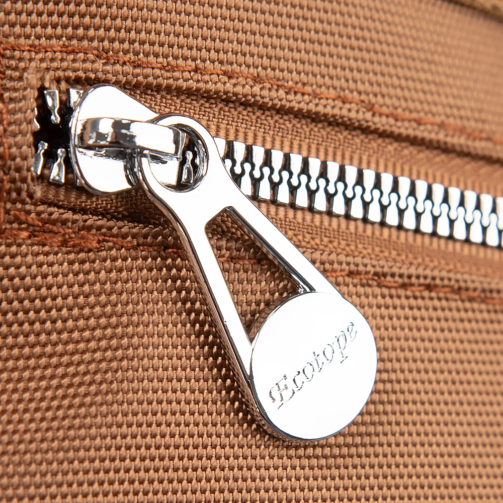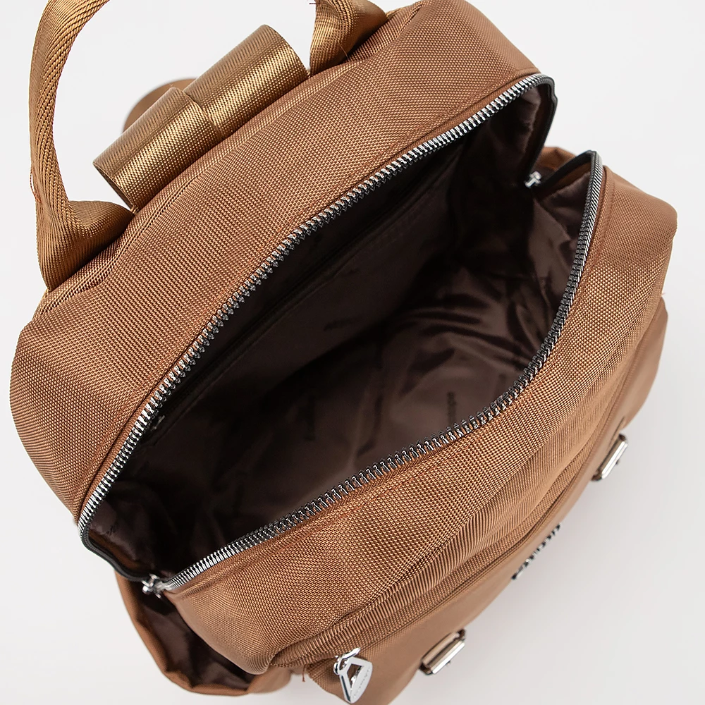Рюкзак от бренда Ecotope из практичного текстильного материала коричневого цвета. Модель с ручкой-переноской, регулируемыми плечевыми ремнями. Основное отделение на молнии. Внутри: текстильная подкладка, накладной карман. На лицевой стороне – два кармана на молнии, накладной карман с клапаном на металлических застежках. По бокам – накладной карман.