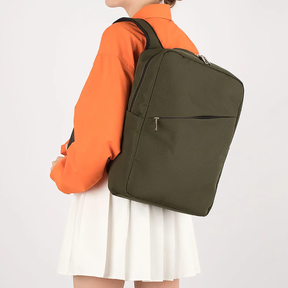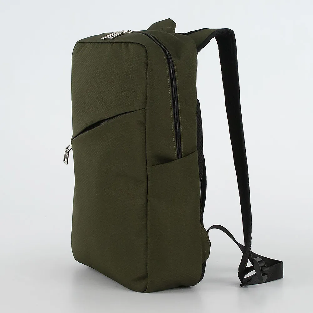 Рюкзак от торговой марки «Медведково» из плотного текстильного материала цвета хаки с узором в виде сот. Плоская модель с лямкой-пер еноской и плечевыми лямками с прочной конструкцией в форме майки. Отделение на молнии. Внутри: накладной карман с уплотненной стенкой, карман-сетка. На спинке - лямка для крепления на выдвижную ручку чемодана. На лицевой стороне – карман на молнии, по бокам – карман без застежки.