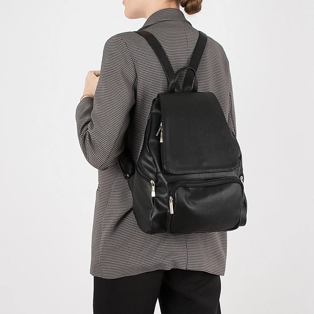 Рюкзак от торговой марки Passo Avanti из искусственной кожи черного цвета. Модель с лямкой-переноской и регулируемым плечевыми лямка ми. Закрывается клапаном. Отделение на молнии. Внутри: фирменная подкладка, карман на молнии, два накладных кармана. На лицевой стороне – накладной карман на молнии. По бокам и на спинке – карман на молнии.