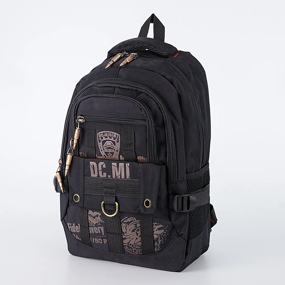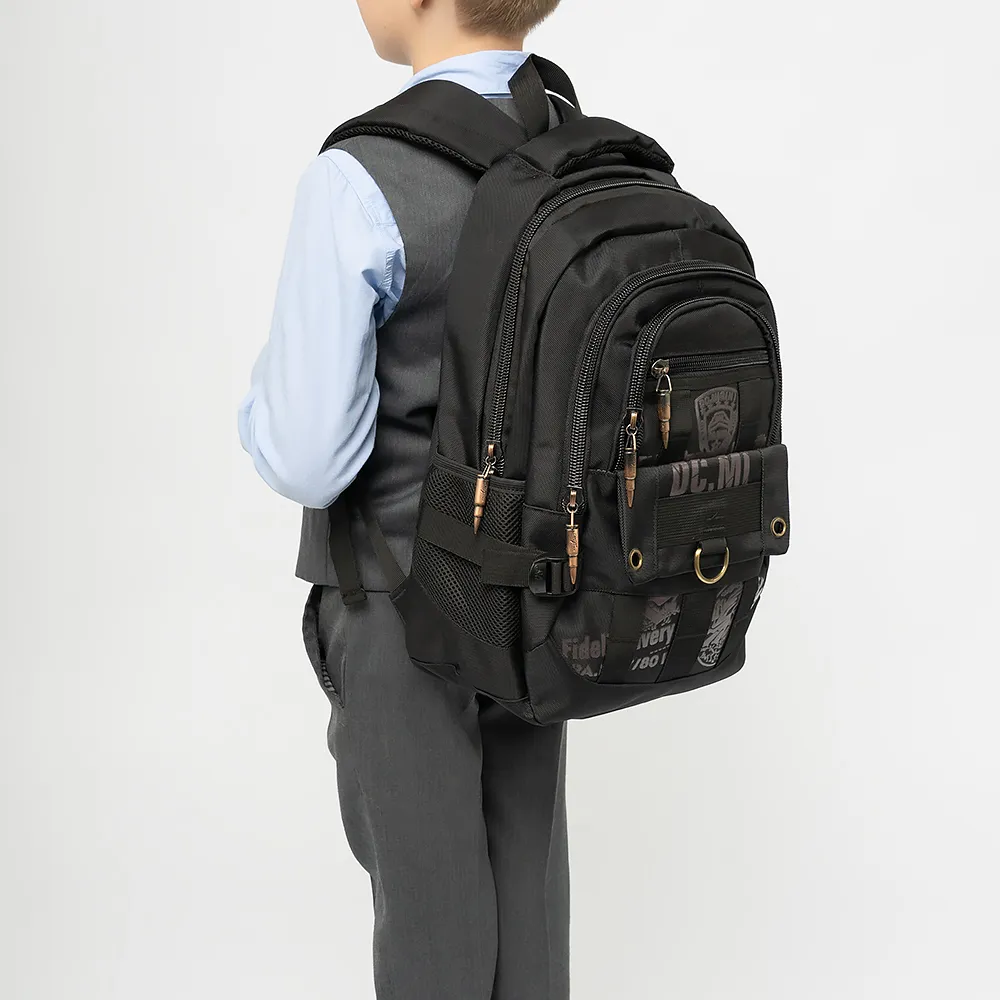 Рюкзак от торговой марки Miqini из плотного практичного текстильного материала черного цвета. Модель с лямкой-переноской, плотной ру чкой и широкими регулируемыми плечевыми лямками со светоотражателями и нагрудными ремнями-стабилизаторами. Два отделения на молнии, с текстильной подкладкой. В основном отделении – накладной карман. На лицевой стороне, декорированной рисунком, два кармана на молнии и накладной карман на липучке, кольцо для крепления. Молнии с оригинальными пуллерами в виде патронов. По бокам – карман-сетка на резинке, стягивающие ремни с застежкой-фастекс. Спинка с анатомической вставкой и дышащим верхним слоем. Вес рюкзака – 910 грамм.