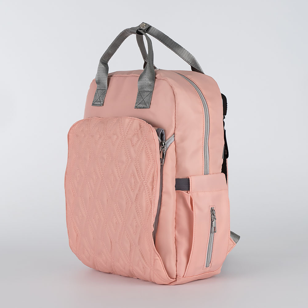 Рюкзак для мам от торговой марки Ecotope из текстильного материала светло-розового цвета. Лицевая сторона декорирована ромбовидной с тежкой. Модель с двумя ручками с фиксатором на кнопке и регулируемыми плечевыми лямками и съемными ремнями-липучками для фиксации рюкзака на коляску. Отделение на молнии. Внутри: текстильная подкладка, накладной карман с уплотнённой стенкой, карман на молнии, два накладных кармана-сетки, по бокам – резинки для фиксации бутылочек. На лицевой стороне – карман на молнии и липучке. На стенке – три термокармана. Карман раскрывается на 90 градусов и представляет собой раскладной пеленальный матрас с непромокаемой стороной; фиксируется липучками. На задней стороне – вертикальный карман на молнии, лямка для крепления на выдвижную ручку чемодана. По бокам – карманы без застежки на резинке, имеется карман на молнии для быстрого доступа.