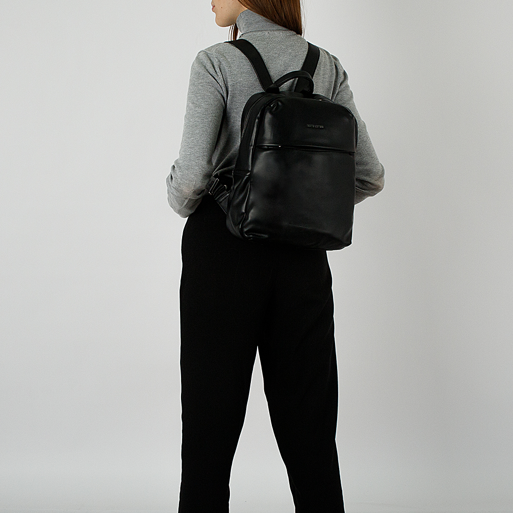 Рюкзак от торговой марки David Jones из искусственной кожи черного цвета. Модель с плотной лямкой и регулируемыми плечевыми лямками. Отделение на молнии. Внутри: фирменная подкладка, карман на молнии, накладной карман, карман с уплотненной стенкой на липучке. На лицевой и задней сторонах – карман на молнии.