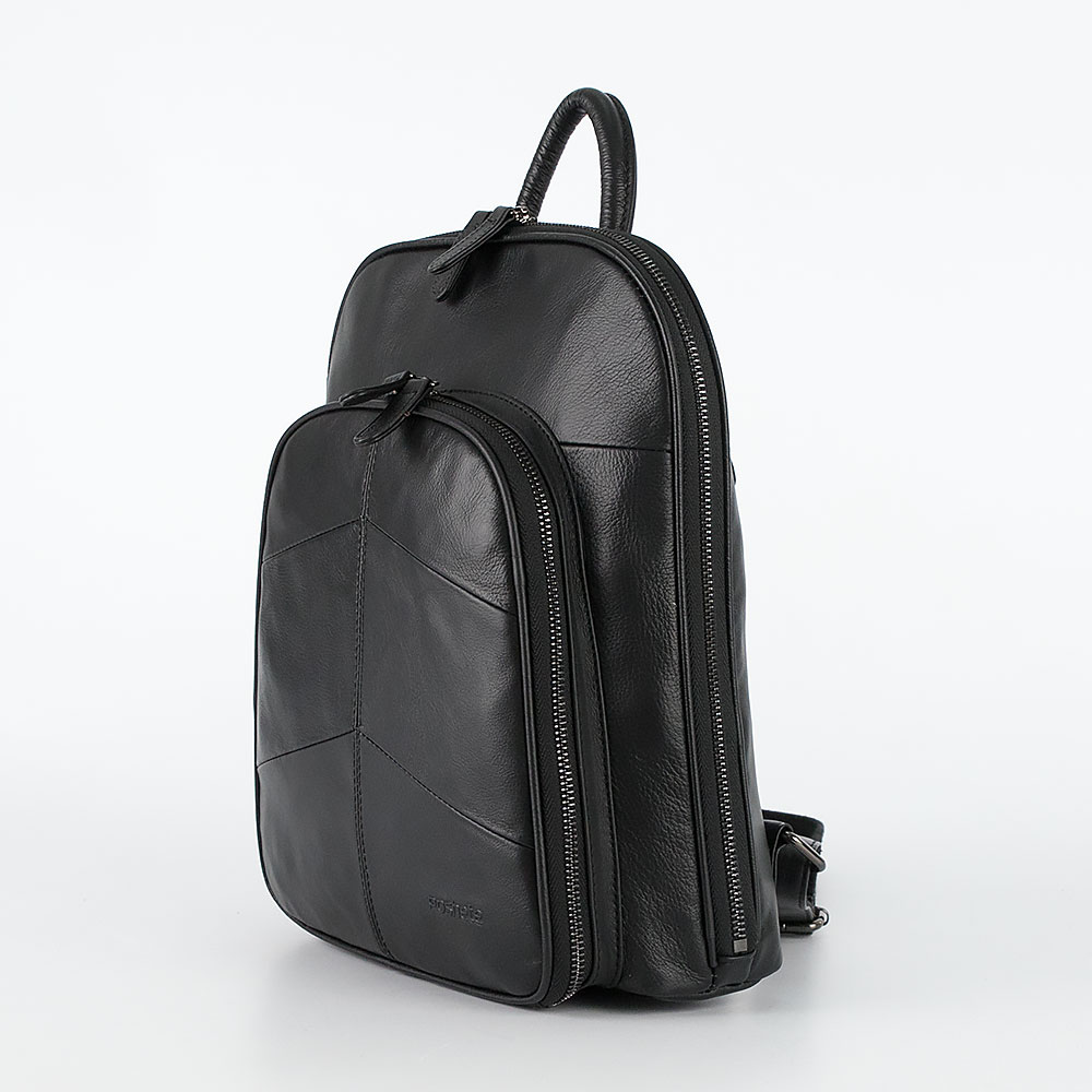 Стильный рюкзак от бренда Poshete выполнен из натуральной кожи насыщенного черного цвета. Модель в форме купола, с плотной ручкой и двумя плечевыми лямками с текстильной изнаночной стороной. Отделение на молнии по трем сторонам, что обеспечивает удобный доступ внутрь. Широко раскрывается гармошкой за счет вытачек. Внутри: средник и карман на молнии, накладной карман. На задней стороне – карман на молнии. На передней – накладной закругленный карман на молнии.