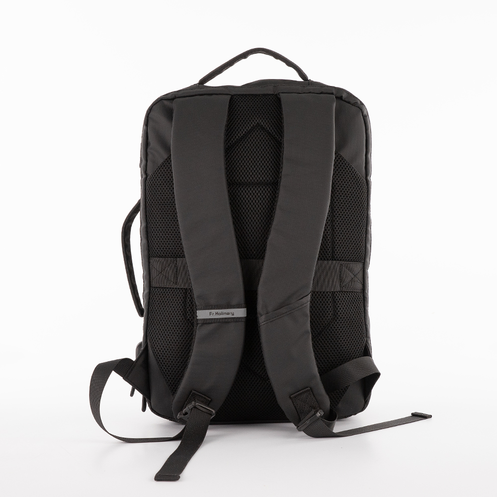 Функциональная сумка-рюкзак от торговой марки Francesco Molinary из прочного износостойкого полиэстера плотностью 900 Ден черного цвета. Модель с ручками сверху и сбоку (для ношения в качестве сумки), регулируемыми плечевыми лямками, которые убираются в карман на спинке; на плечевых лямках имеется кармашек и светоотражатели. Два отделения на молнии, с фирменной подкладкой. В основном отделении – два накладных кармана-сетки, органайзер для канцелярских принадлежностей. Заднее отделение на молнии по трем сторонам, что обеспечивает раскрытие на 180° и удобный доступ. Внутри: карман с уплотненной стенкой для ноутбука с фиксирующими эластичными ремнями, накладной карман. На лицевой стороне – непромокаемый карман на молнии. На спинке с верхним дышащим слоем имеется лямка для крепления на выдвижную ручку чемодана сбоку – выход для наушников.