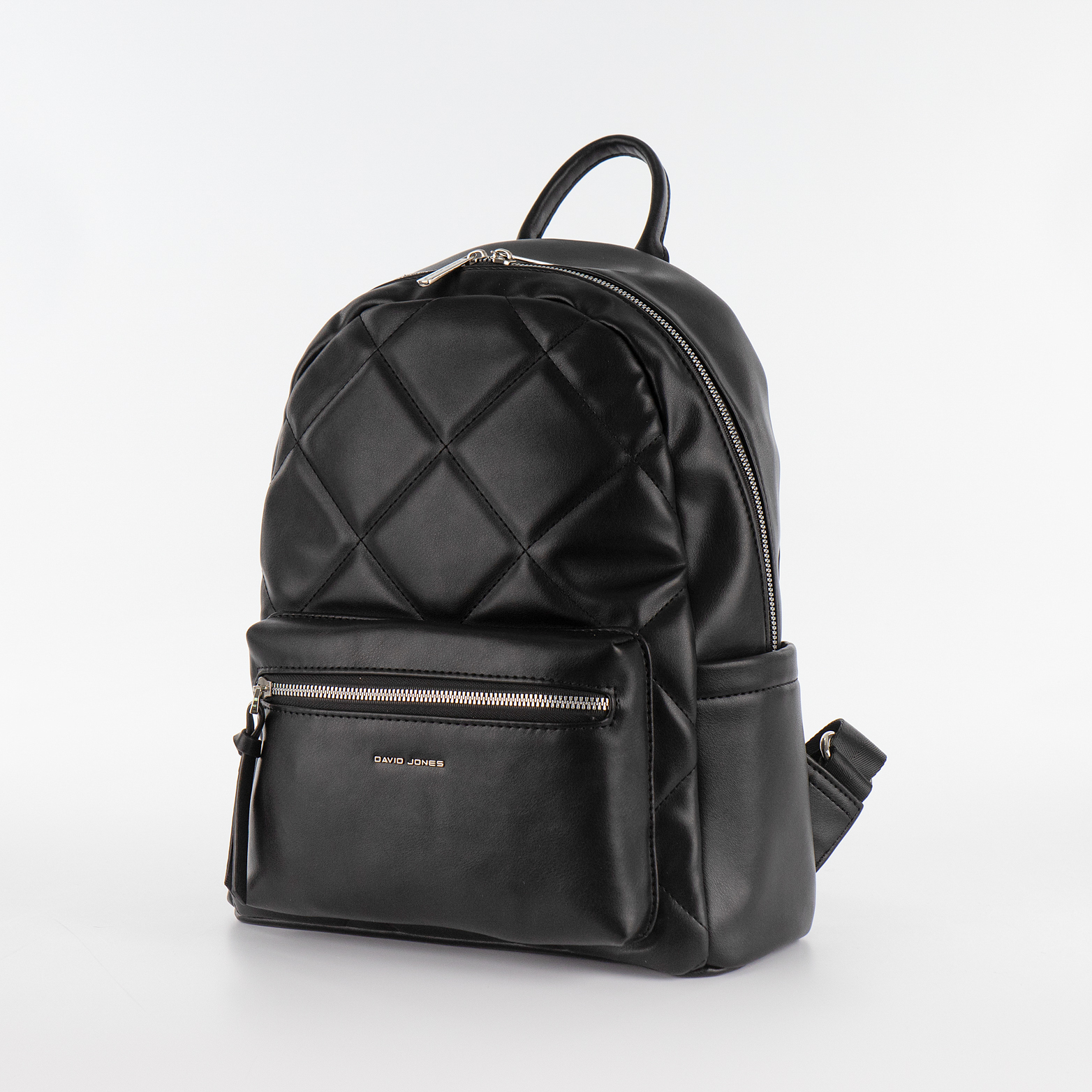 Рюкзак от торговой марки David Jones из искусственной кожи черного цвета. Лицевая сторона декорирована крупной ромбовидной стежкой. Модель с лямкой-переноской, регулируемыми плечевыми лямками. Отделение на молнии. Внутри: фирменная подкладка, карман на молнии, накладной карман. По бокам – карман без застежки. На лицевой стороне – накладной карман на молнии. На задней стороне – карман на молнии.
