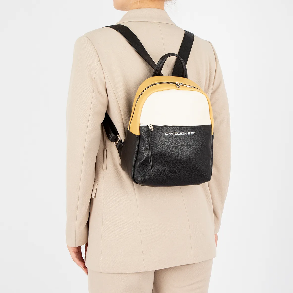 Рюкзак от торговой марки David Jones из искусственной кожи черного цвета с декоративными вставками бежевого и желтого цвета. Модель с лямкой-переноской и регулируемыми плечевыми лямками, выполненными из текстильного материала. Отделение на молнии. Внутри: фирменная подкладка, карман на молнии, накладной карман. На лицевой и задней сторонах – карман на молнии.