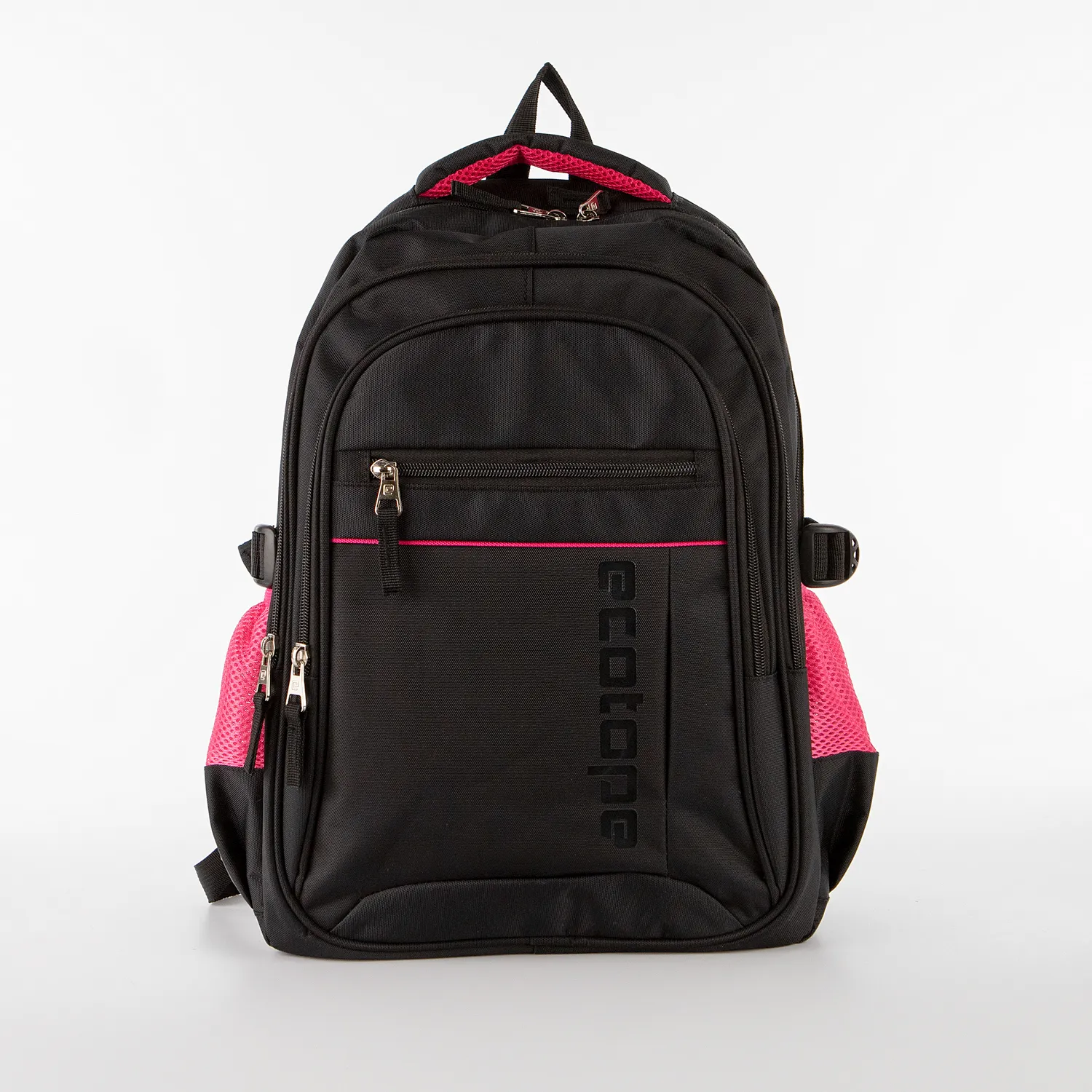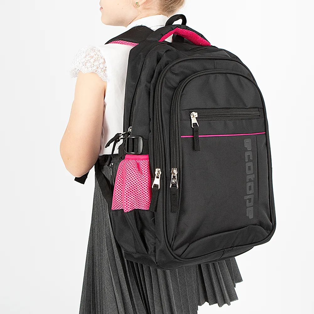 Рюкзак от торговой марки Ecotope из текстильного материала черного цвета с вставками цвета фуксия. Модель с лямкой-переноской, плотной ручкой, регулируемыми плечевыми лямками. Два отделения на молнии, с текстильной подкладкой. В основном отделении – накладной карман. На лицевой стороне – два кармана на молнии. По бокам – карман-сетка на резинке, стягивающие ремни на застежке фастекс. Сбоку имеется отверстие для наушников.