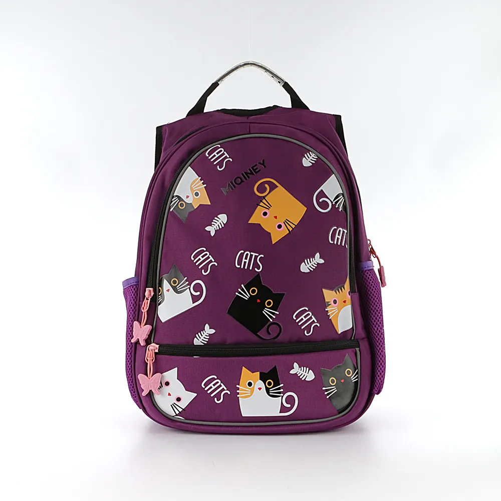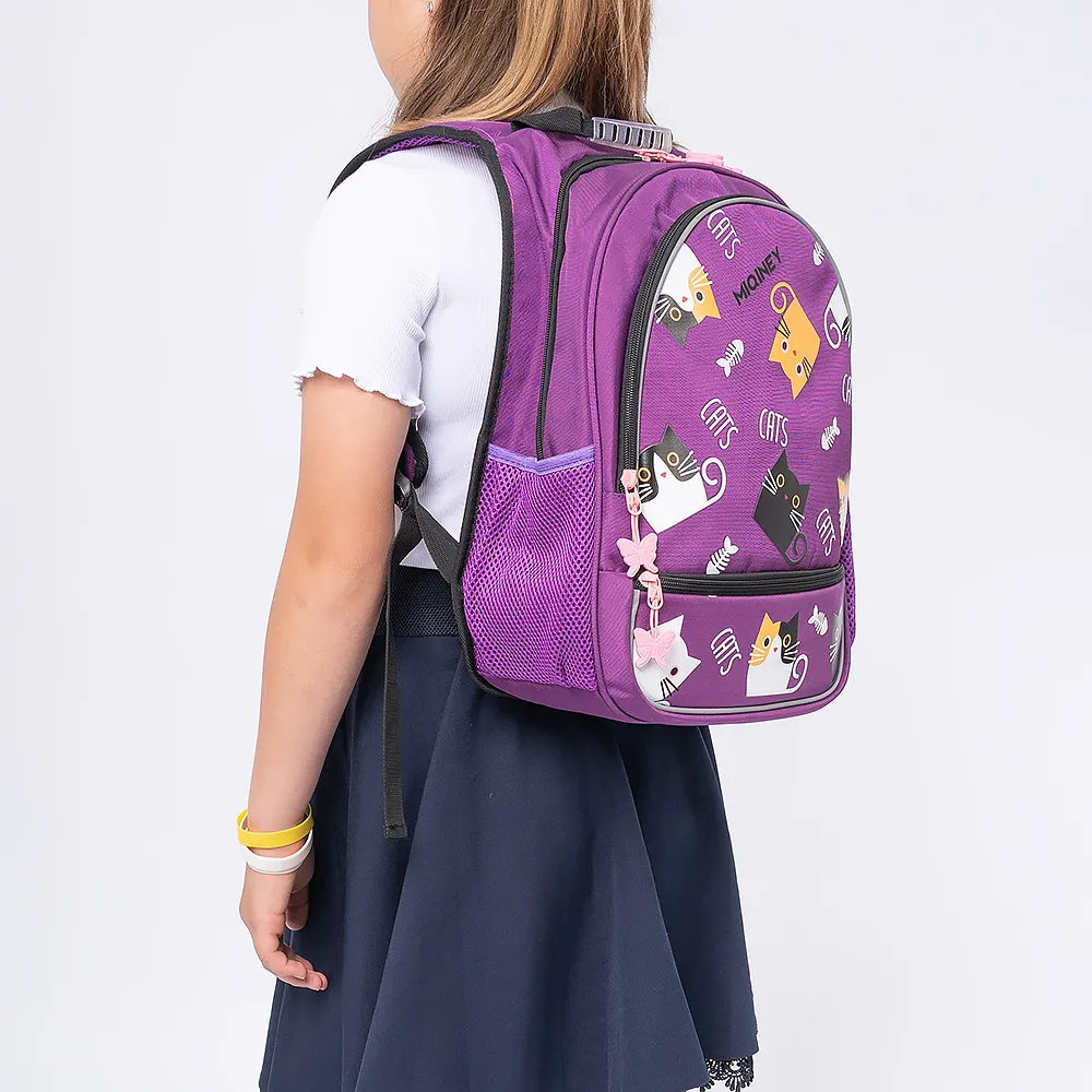 Рюкзак от торговой марки Miqini из практичного текстильного материала фиолетовего цвета. Декорирован ярким принтом с кошками. Модель с лямкой-переноской с пластиковой накладкой и регулируемыми плечевыми лямками прочной конструкции в виде майки. Отделение на молнии. Внутри: текстильная подкладка, накладной карман. На лицевой стороне – два кармана на молнии. По бокам – карман-сетка на молнии. Спинка с мягкими анатомическими накладками; на плечевых лямках – светоотражатели, повышающие безопасность в темное время.