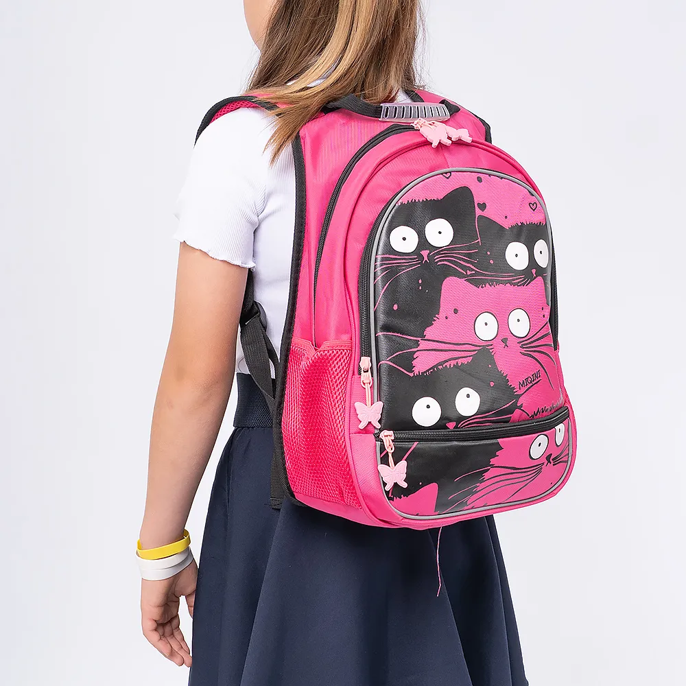 Рюкзак от торговой марки Miqini из практичного текстильного материала. Декорирован принтом с кошками. Модель с лямкой с прорезиненной накладкой и регулируемыми плечевыми лямками прочной конструкции в виде майки со светоотражателями, повышающими безопасность в темное время. Спинка с анатомическими вставками с верхним дышащим слоем. Два отделения на молнии с текстильной подкладкой. Внутри основного отделения: накладной карман. На лицевой стороне – карман на молнии. По бокам – карман-сетка. Молнии с оригинальными пуллерами в виде бабочек.
