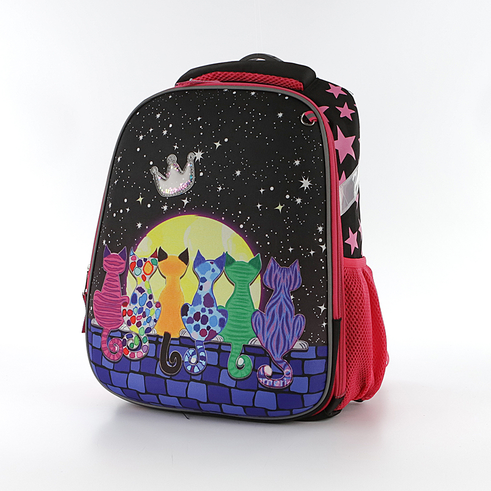 Ранец от торговой марки Ecotope из плотного текстильного материала. Декорирован рисунком с изображением кошек на фоне луны и звезд; имеется прозрачная аппликация в виде короны с мерцающими звездочками. Модель с лямкой-переноской с пластиковой накладкой, мягкой набивной ручкой, регулируемыми плечевыми лямками с более износостойкой конструкцией в форме майки со светоотражателями, повышающими безопасность в темное время. Ортопедическая спинка с анатомическими вставками с верхним дышащим слоем. Два отделения на молнии, с текстильной подкладкой. В основном отделении – накладной карман и фиксирующая резинка. По бокам – карман-сетка. На лицевой стороне – кольцо для крепления брелока.