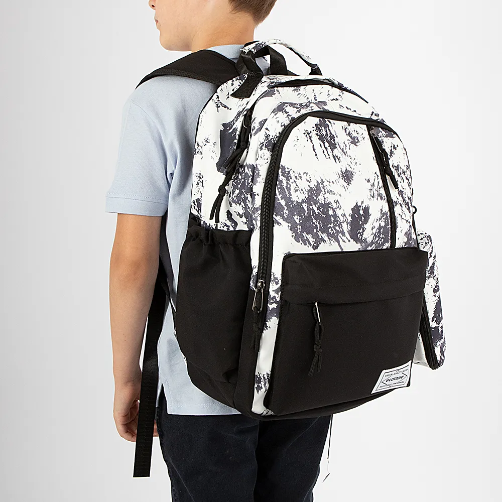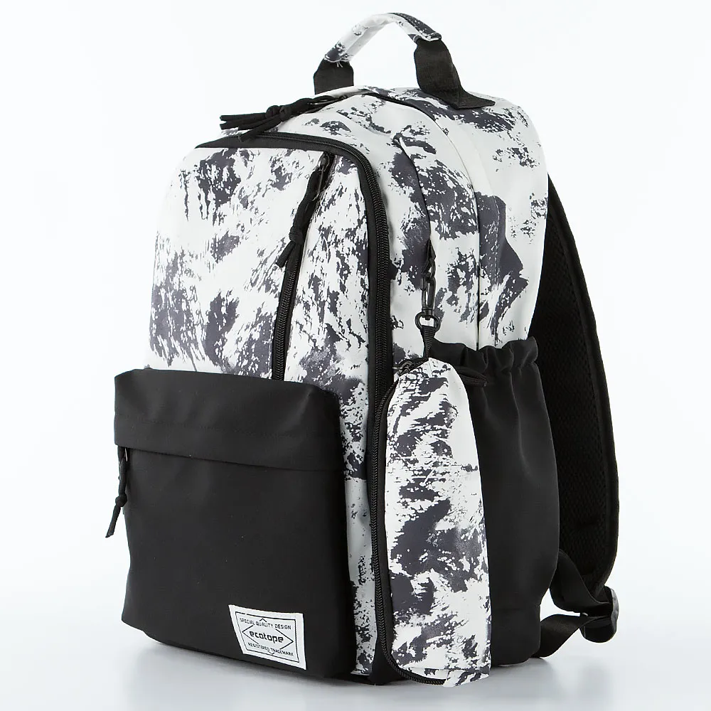 Рюкзак от торговой марки Ecotope из текстильного материала в сочетании черного и белого цвета. Модель с одной ручкой, лямкой-переноской, регулируемыми плечевыми лямками. Два отделения на молнии, с текстильной подкладкой. В основном отделении – накладной карман с уплотненной стенкой. На лицевой стороне – вертикальный карман на молнии, накладной карман на молнии. По бокам – карман на резинке. На задней стороне – вертикальный карман на молнии. В комплекте имеется мягкий съемный пенал с отделением на молнии без подкладки.