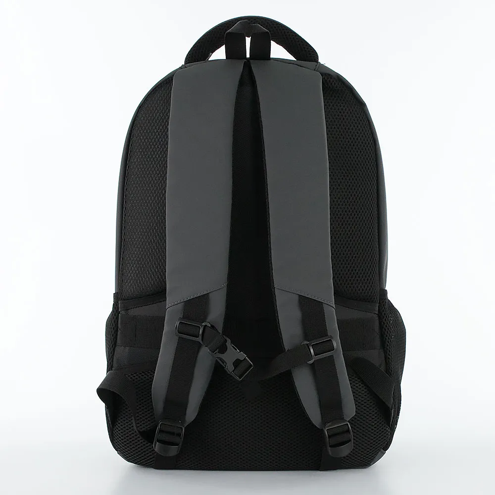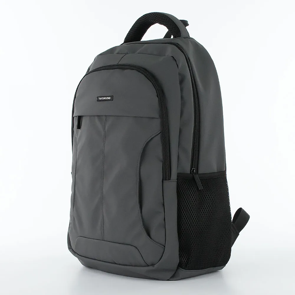 Рюкзак от торговой марки Tayongzhe из плотного текстильного в сочетании серого и черного цвета. Модель с плотной ручкой, лямкой-переноской, уплотненными регулируемыми плечевыми лямками с нагрудным фиксатором для распределения нагрузки. Два отделения на молнии. В основном: текстильная подкладка, накладной карман с уплотненной стенкой для ноутбука. В переднем отделении – накладной карман с органайзером. Уплотненная спинка с анатомическими вставками; имеется лямка для крепления на выдвижную ручку чемодана. По бокам – карман-сетка.