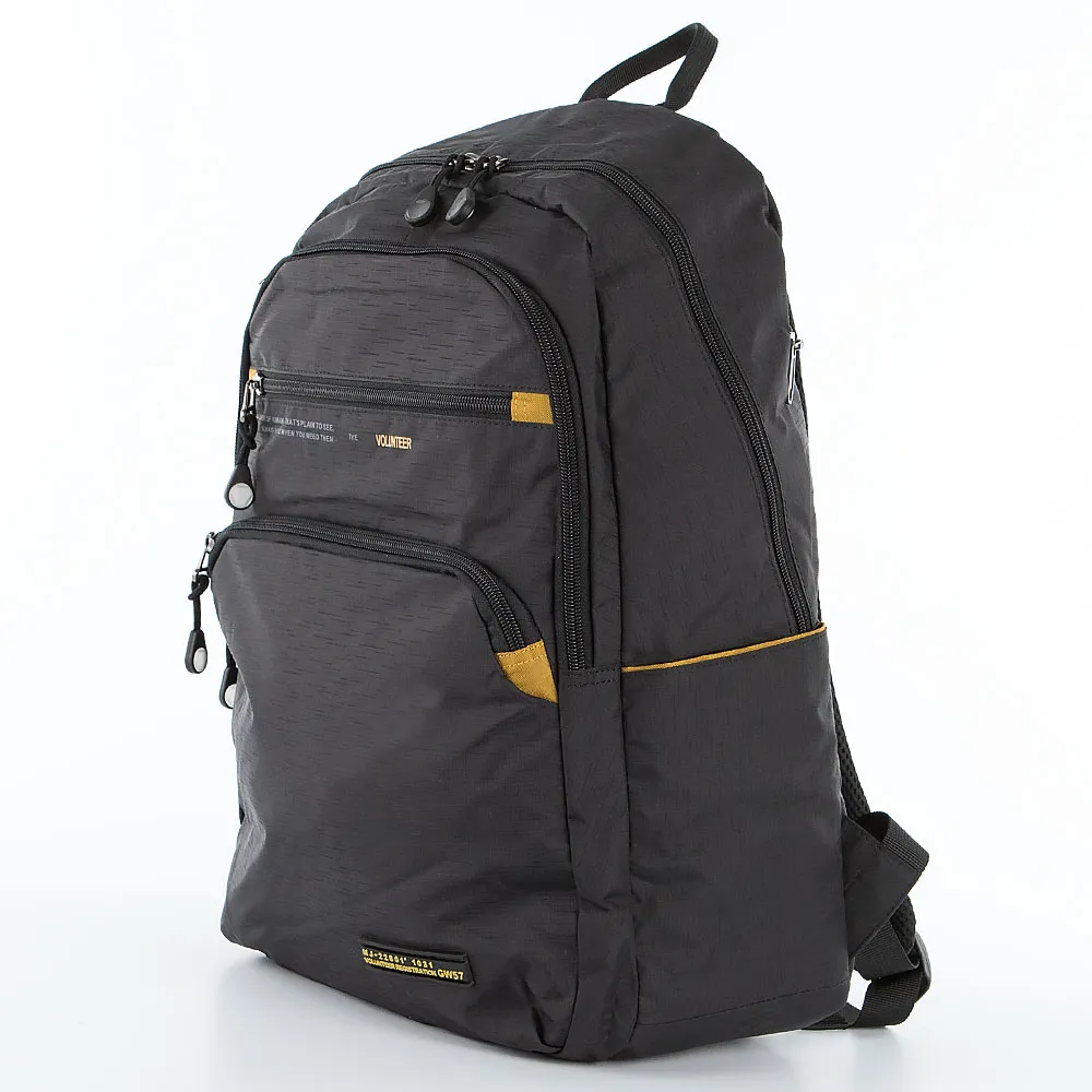 Рюкзак от торговой марки Volunteer из практичного прочного текстильного материала черного цвета. Модель с лямкой-переноской, регулируемыми плечевыми лямками с дышащим верхним слоем, с нагрудным фиксатором для равномерного распределения нагрузки. Отделение на молнии. Внутри: текстильная подкладка, карман на молнии, карман с уплотненной стенкой, два накладных кармана. На лицевой стороне – два кармана на молнии. На задней стороне – карман на молнии. По бокам – карман без застежки. Спинка с анатомической вставкой с дышащим верхним слоем.
