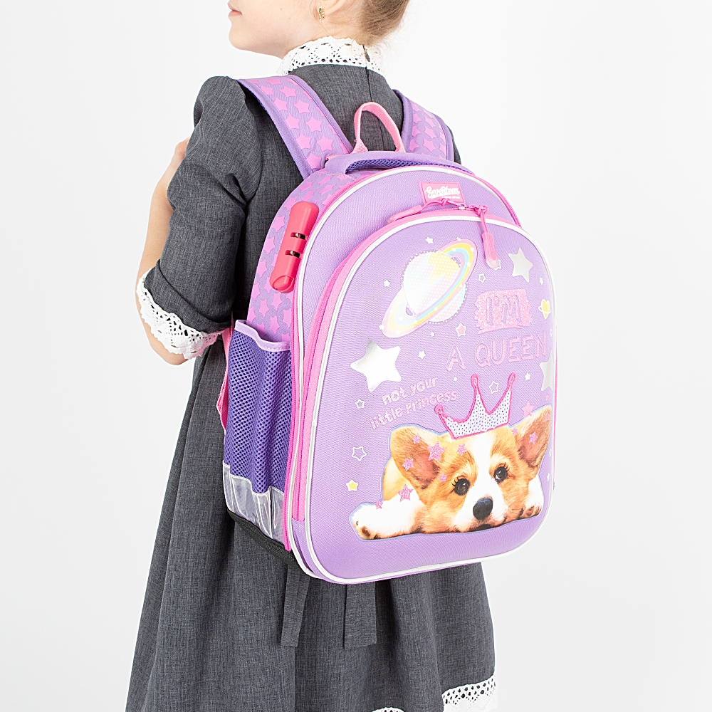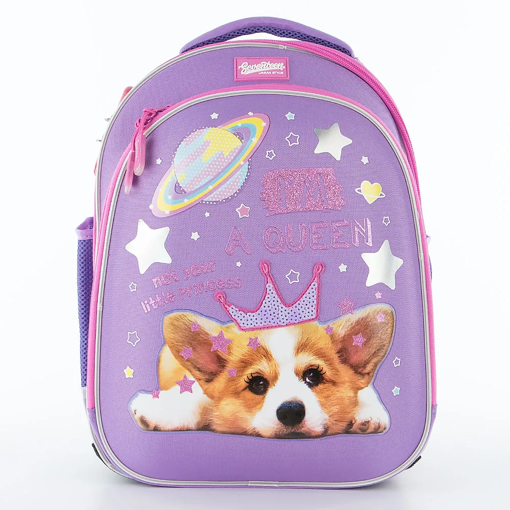 Ранец от торговой марки Seventeen из текстильного материала. Корпус, боковые части и спинка выполнены из легкого водонепроницаемого материала EVA. Модель жесткой конструкции с лямкой-переноской, плотной ручкой, набивными широкими регулируемыми плечевыми лямками с нагрудным фиксатором-стяжкой для распределения нагрузки, металлическими крючками для крепления мешка для обуви. Два отделения на молнии по всему периметру, что облегчает доступ внутрь и уход; внутри: фирменная подкладка. Стенка переднего отделения представляет собой формованную панель, декорированную оригинальным принтом с щенком корги в короне из пайеток и надписью: «I’m a Queen»; звезды выполнены из голографической печати, надписи и мелкие звездочки выполнены из глиттера, звезды по бокам рюкзака - плотная пафф печать. Внутри: органайзер, кольцо для крепления и карман на молнии; пуллер в виде помпона. Основное отделение дополнительно закрывается кодовым замком. Внутри: два накладных кармана-разделителя, фиксирующая резинка. По бокам – карман-сетка на резинке. Анатомическая вентилируемая спинка с верхним дышащим слоем. Прорезиненное дно оснащено ножками для защиты от износа. Светоотражающие элементы на боковых карманах, лямке и окантовке повышают безопасность ребенка в темное время."