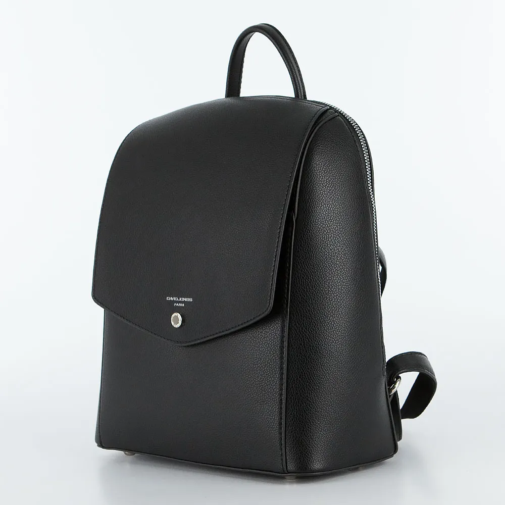 Рюкзак от торговой марки David Jones из искусственной кожи черного цвета. Модель с плотной лямкой-переноской и регулируемыми плечевыми лямками. Отделение на молнии по трем сторонам, что обеспечивает удобный доступ. Внутри: фирменная подкладка, карман на молнии, накладной карман. На лицевой стороне – накладной карман с клапаном на магнитной кнопке. На задней стороне – карман на молнии. Дно оснащено металлическими ножками для защиты от износа.