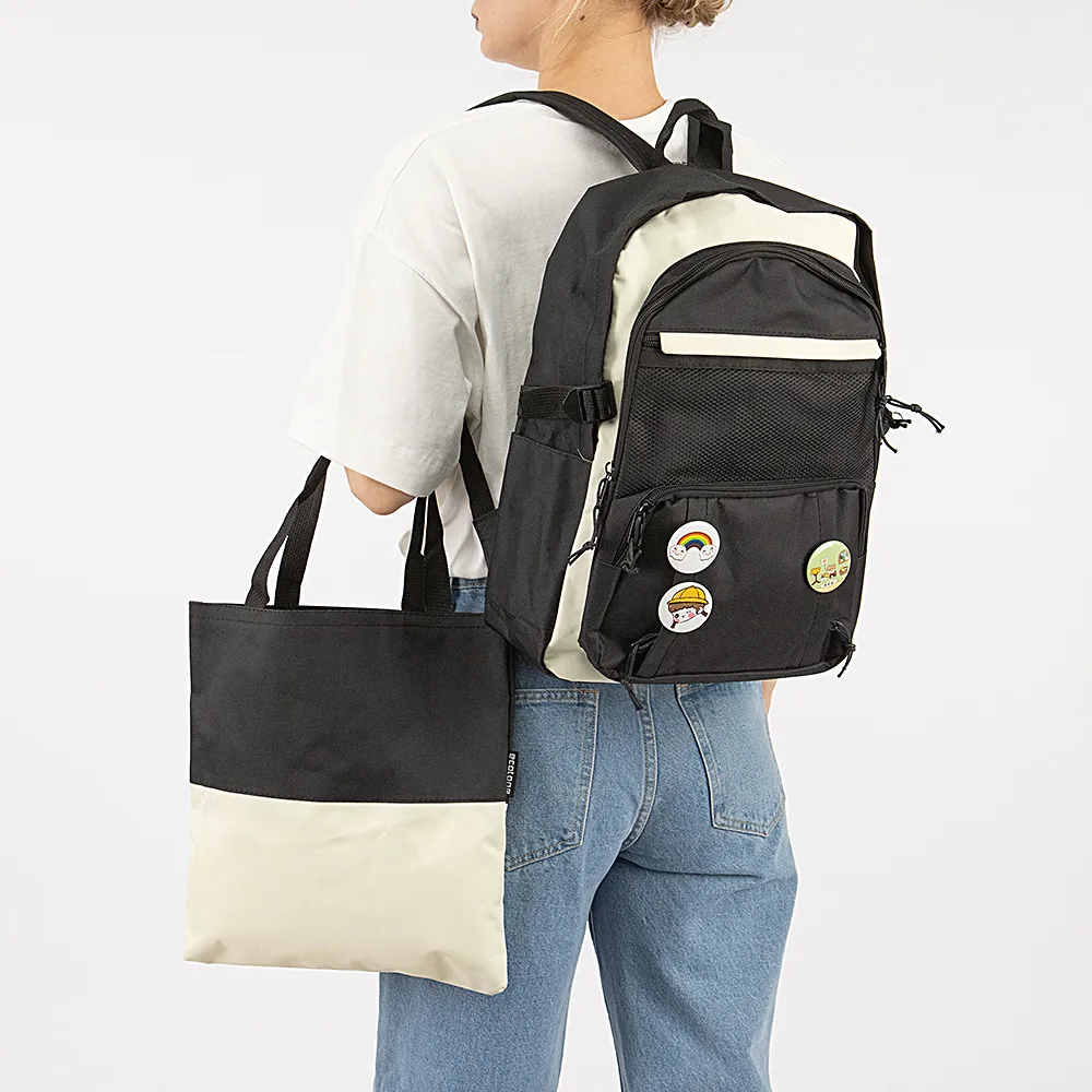 Набор от торговой марки Ecotope из текстильного материала в сочетании черного и белого цвета. Набор состоит из рюкзака, сумки-шоппера, пенала и кошелька. Рюкзак с лямкой-переноской и регулируемыми плечевыми лямками. Два отделения на молнии, с текстильной подкладкой. В основном отделении – накладной карман. На лицевой стороне – четыре кармана на молнии. По бокам – стягивающие ремни-фиксаторы. Вместительный шоппер с двумя ручками. Пенал с отделением на молнии и петлей для крепления. В комплекте имеются декоративные значки.
