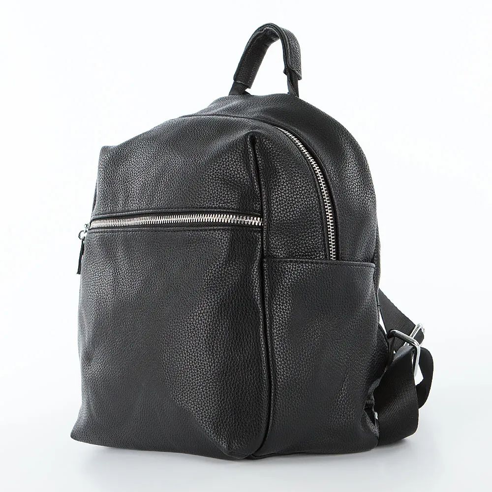 Рюкзак от торговой марки Passo Avanti из искусственной кожи черного цвета. Модель с лямкой-переноской, регулируемыми плечевыми лямками. Отделение на молнии. Внутри: карман на молнии, накладной карман, перегородка с карманом на молнии, образующая накладной карман. На лицевой стороне – карман на молнии. На задней стороне – вертикальный карман на молнии.