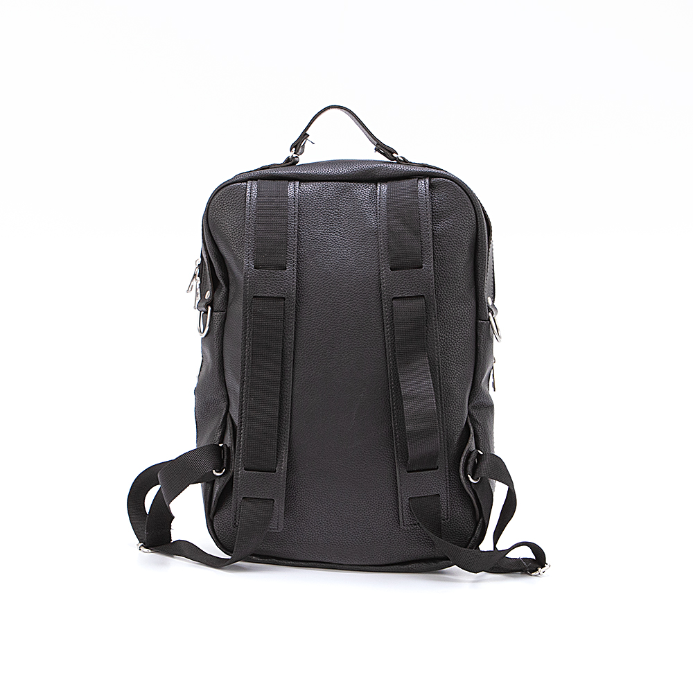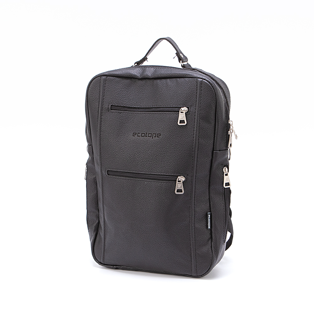 Рюкзак от торговой марки Ecotope из искусственной кожи черного цвета. Модель с одной ручкой и регулируемыми плечевыми лямками. Отделение на молнии. Внутри: текстильная подкладка, накладной карман с уплотненной стенкой. На лицевой стороне – два кармана на молнии.