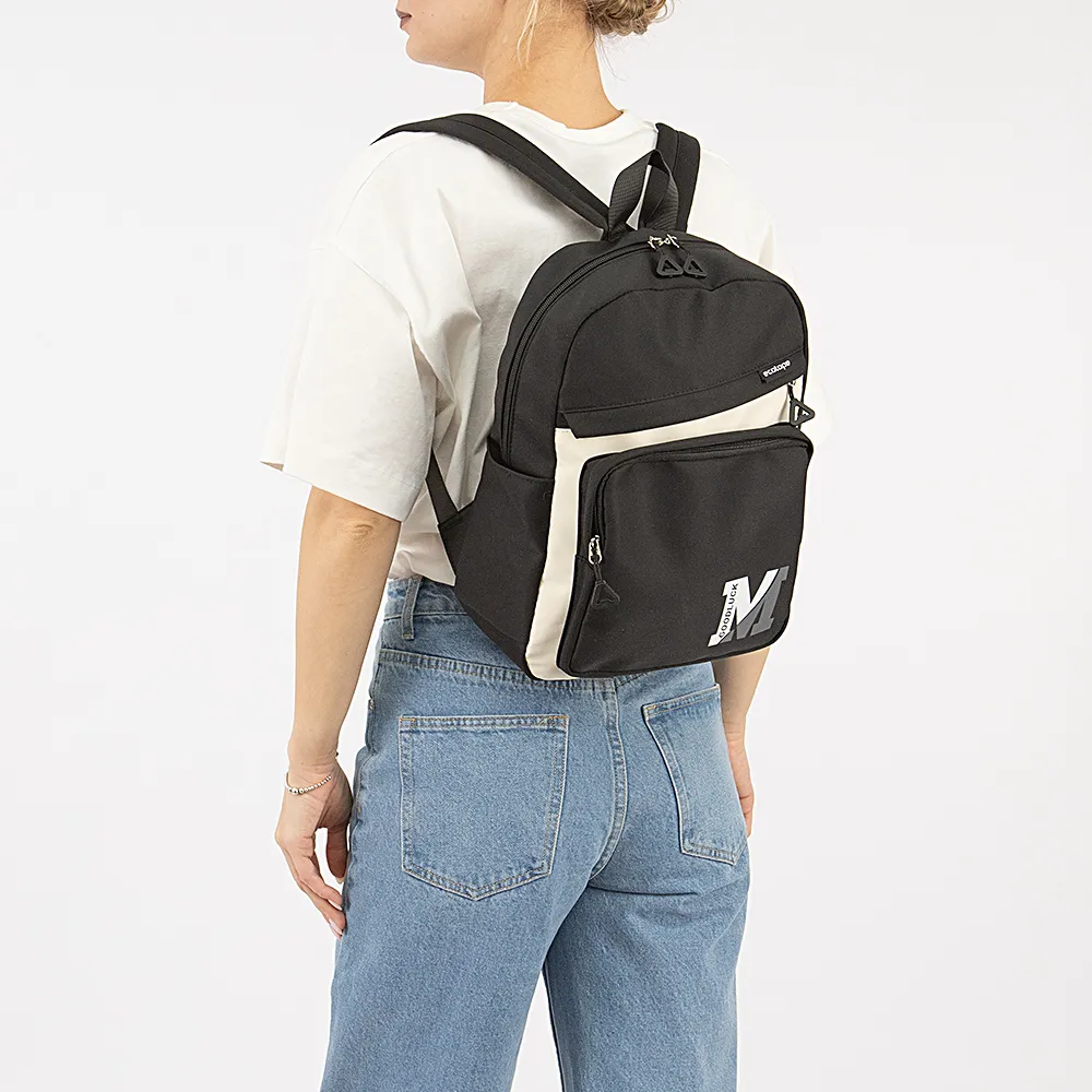 Рюкзак от торговой марки Ecotope из текстильного материала черного цвета с бежевой вставкой. Модель с лямкой и регулируемыми плечевыми лямками. Отделение на молнии. Внутри: текстильная подкладка, накладной карман с уплотненной стенкой. По бокам – накладной карман без застежки. На лицевой стороне – два кармана на молнии. На спинке – вертикальный карман на молнии.