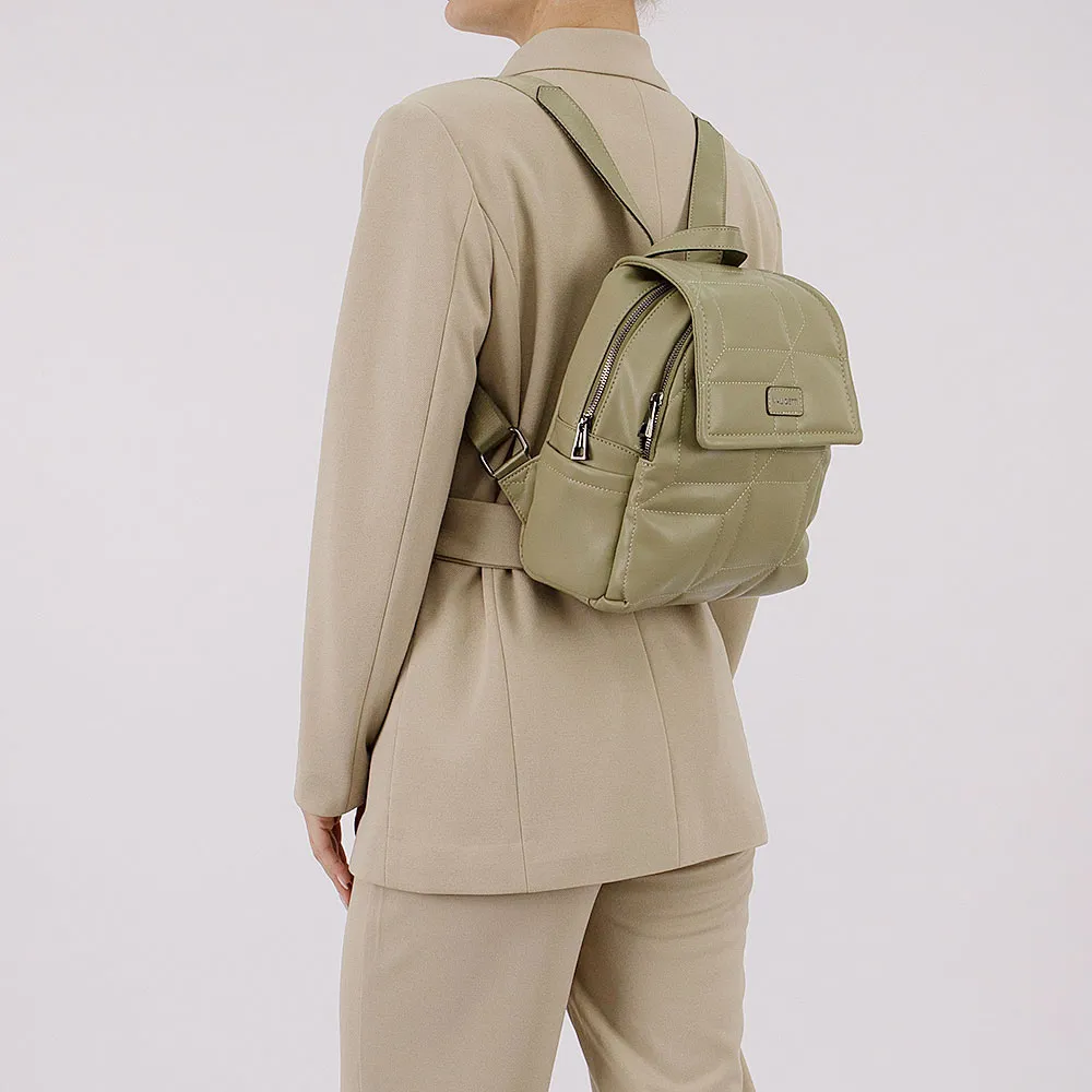 Рюкзак от торговой марки Valigetti из искусственной кожи оливкового цвета. Декорирована оригинальной стежкой. Модель с лямкой-переноской и регулируемыми плечевыми лямками. Клапан на магнитной кнопке закрывает накладной карман на молнии и отделение на молнии. Внутри: фирменная подкладка, карман на молнии. На спинке – вертикальный карман на молнии. По бокам – накладной карман.