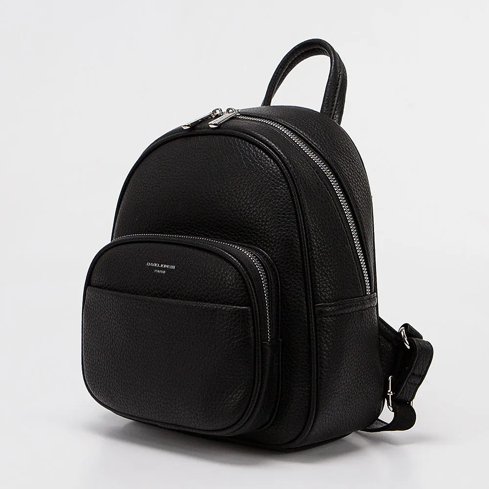Рюкзак от торговой марки David Jones из искусственной кожи черного цвета. Компактная модель с лямкой-переноской и регулируемыми плечевыми лямками. Отделение на молнии. Внутри: фирменная подкладка, карман на молнии, накладной карман. На лицевой стороне – карман на молнии, накладной карман на магнитной кнопке. На задней стороне – карман на молнии.