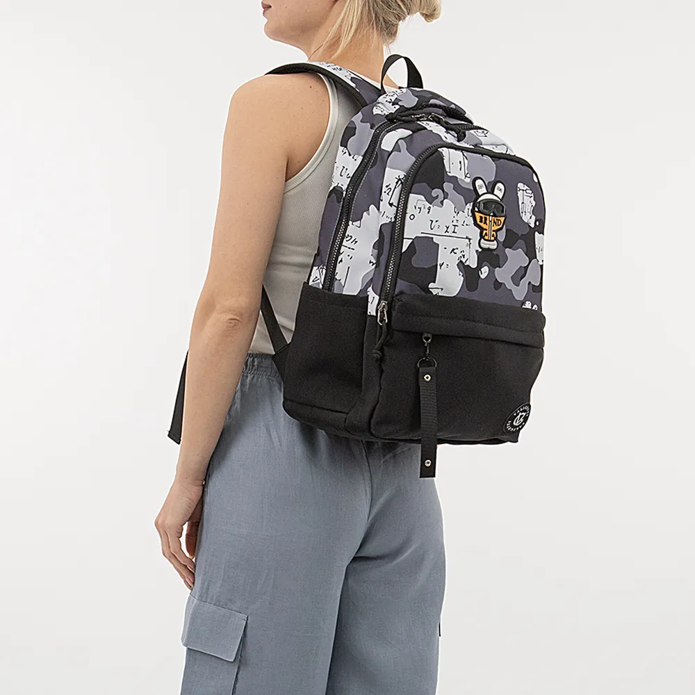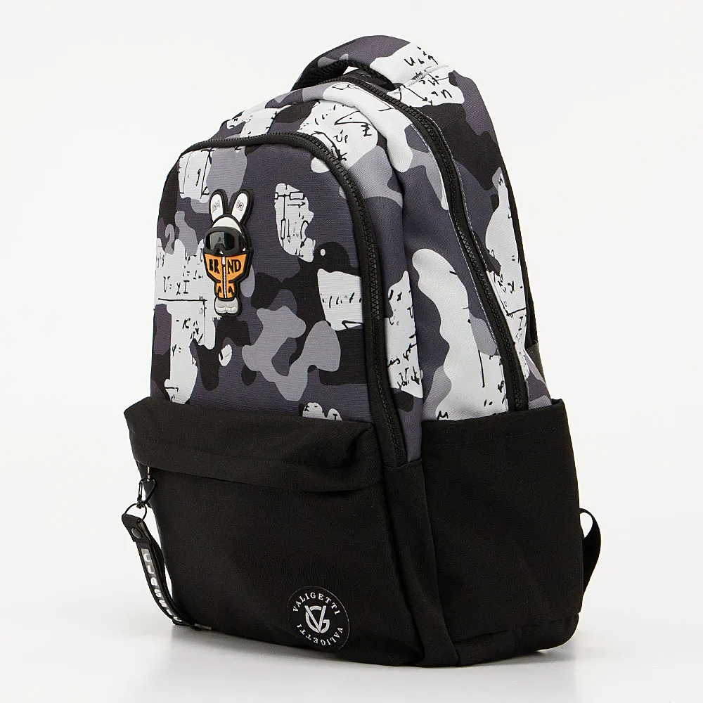 Рюкзак от торговой марки Valigetti из текстильного материала с принтом «камуфляж». Модель с лямкой-переноской и мягкой набивной ручкой, широкими плотными регулируемыми плечевыми лямками. Два отделения на молнии, с текстильной подкладкой. В основном отделении – накладной карман с уплотненной стенкой. На лицевой стороне, декорированной прорезиненной нашивкой в виде зайца в очках, имеется карман на молнии. На спинке – лямка для крепления на выдвижную ручку чемодана.