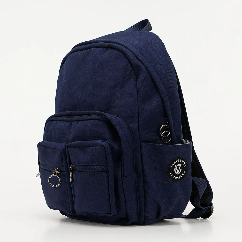 Рюкзак от торговой марки Valigetti из текстильного материала темно-синего цвета. Модель с лямкой-переноской и широкими плотными регулируемыми плечевыми лямками. Отделение на молнии. Внутри: текстильная подкладка, два накладных кармана, один из которых с уплотненной стенкой для гаджета. На лицевой стороне – три накладных кармана на молнии. На спинке – лямка для крепления на выдвижную ручку чемодана. По бокам – накладной карман.