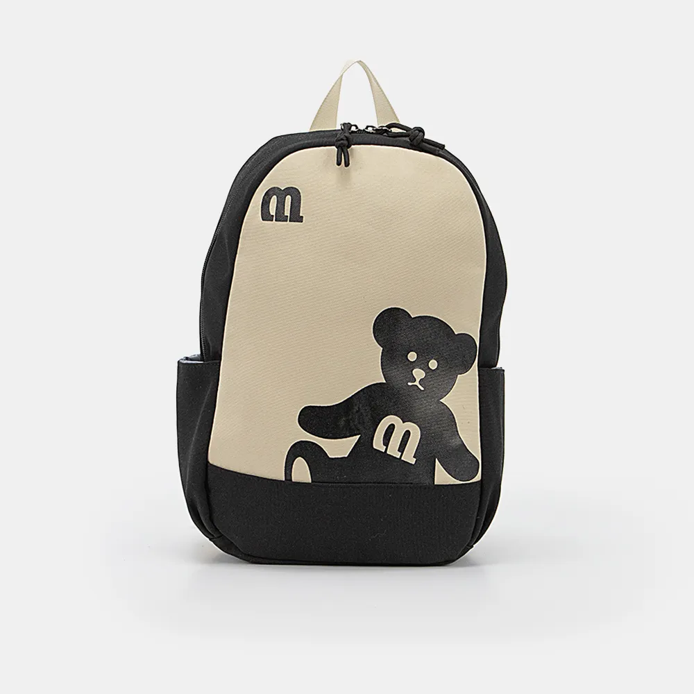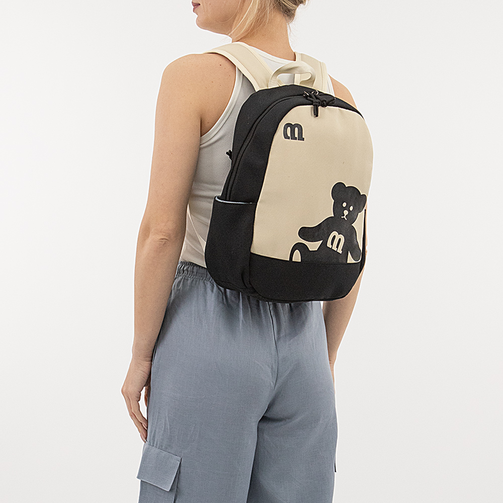 Рюкзак от торговой марки Valigetti из текстильного материала в сочетании черного и бежевого цвета. Лицевая сторона декорирован принтом с изображением мишки. Модель с лямкой-переноской, плотными регулируемыми плечевыми лямками. Отделение на молнии. Внутри: текстильная подкладка, два накладных кармана, вместительный накладной карман с уплотненной стенкой для ноутбука. По бокам – накладной карман без застежки. На спинке имеется карман-антивор на молнии.