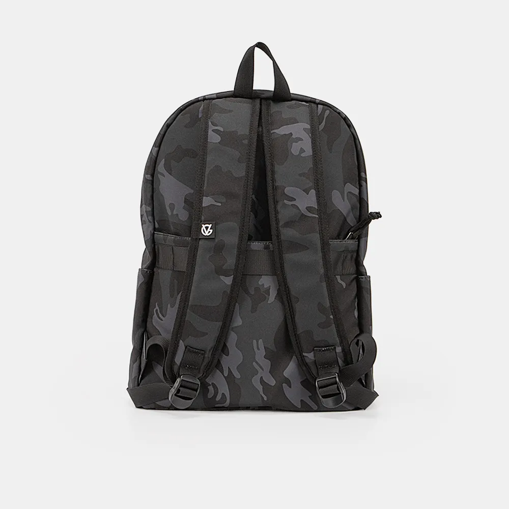 Рюкзак от торговой марки Valigetti из текстильного материала с принтом «камуфляж». Модель с лямкой-переноской и широкими плотными регулируемыми плечевыми лямками. Отделение на молнии. Внутри: текстильная подкладка, три накладных кармана, один из которых с уплотненной стенкой для гаджета. На лицевой и задней сторонах – карман на молнии. По бокам – накладной карман. На спинке имеется лямка для крепления на выдвижную ручку чемодана.