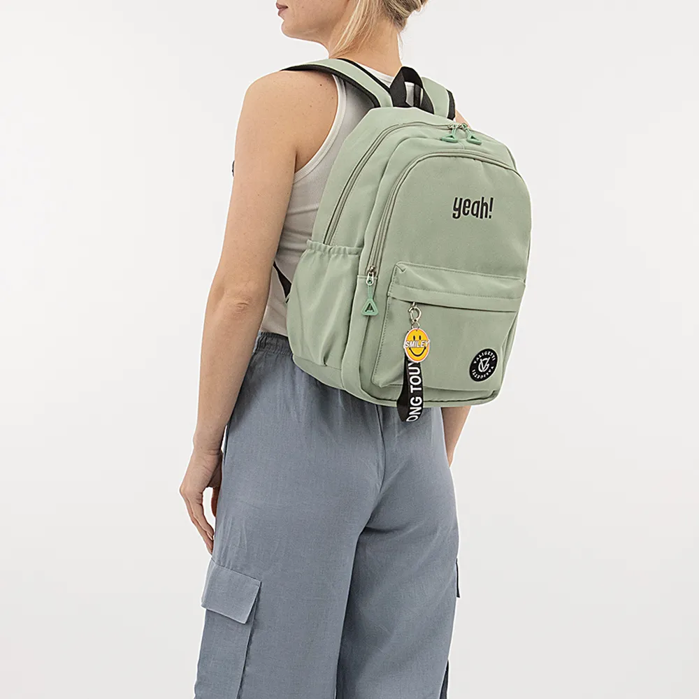 Рюкзак от торговой марки Valigetti из текстильного материала мяьно-зеленого цвета. Модель с лямкой-переноской и широкими плотными регулируемыми плечевыми лямками. Два отделения на молнии. В основном отделении: текстильная подкладка, накладной карман с уплотненной стенкой для ноутбука. На лицевой стороне – накладной карман молнии с оригинальным съемным брелоком-пуллером. По бокам – накладной карман на резинке.