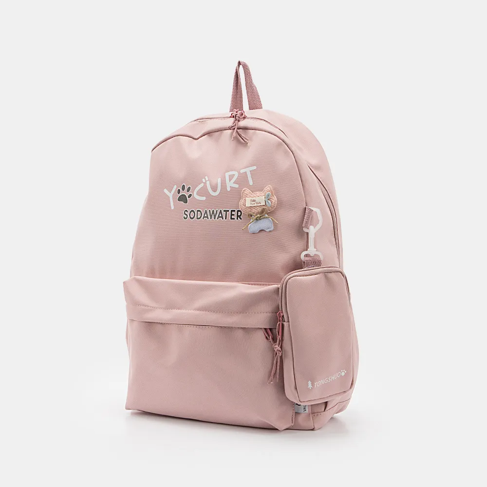 Рюкзак от торговой марки Valigetti из практичного текстильного материала розового цвета. Декорирован надписью и нашивкой-аппликацией в виде кошки. Модель с лямкой-переноской и уплотненными широкими регулируемыми плечевыми лямками. Отделение на молнии. Внутри: текстильная подкладка, накладной карман с уплотненной стенкой для ноутбука. На лицевой стороне – накладной карман на молнии. По бокам – накладной карман на резинке. На спинке имеется карман-антивор на молнии. В комплекте имеется пенал на карабине, с отделением на молнии.