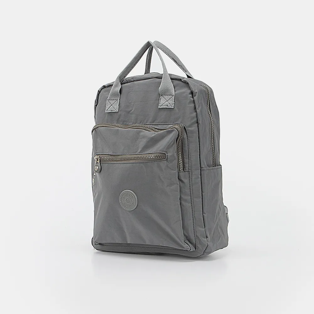 Рюкзак от торговой марки Valigetti из практичного текстильного материала серого цвета. Модель с двумя ручками, регулируемыми плечевыми лямками. Отделение на молнии. Внутри: текстильная подкладка, карман на молнии. На лицевой стороне – два кармана на молнии. На спинке – карман на молнии. По бокам – накладной карман.