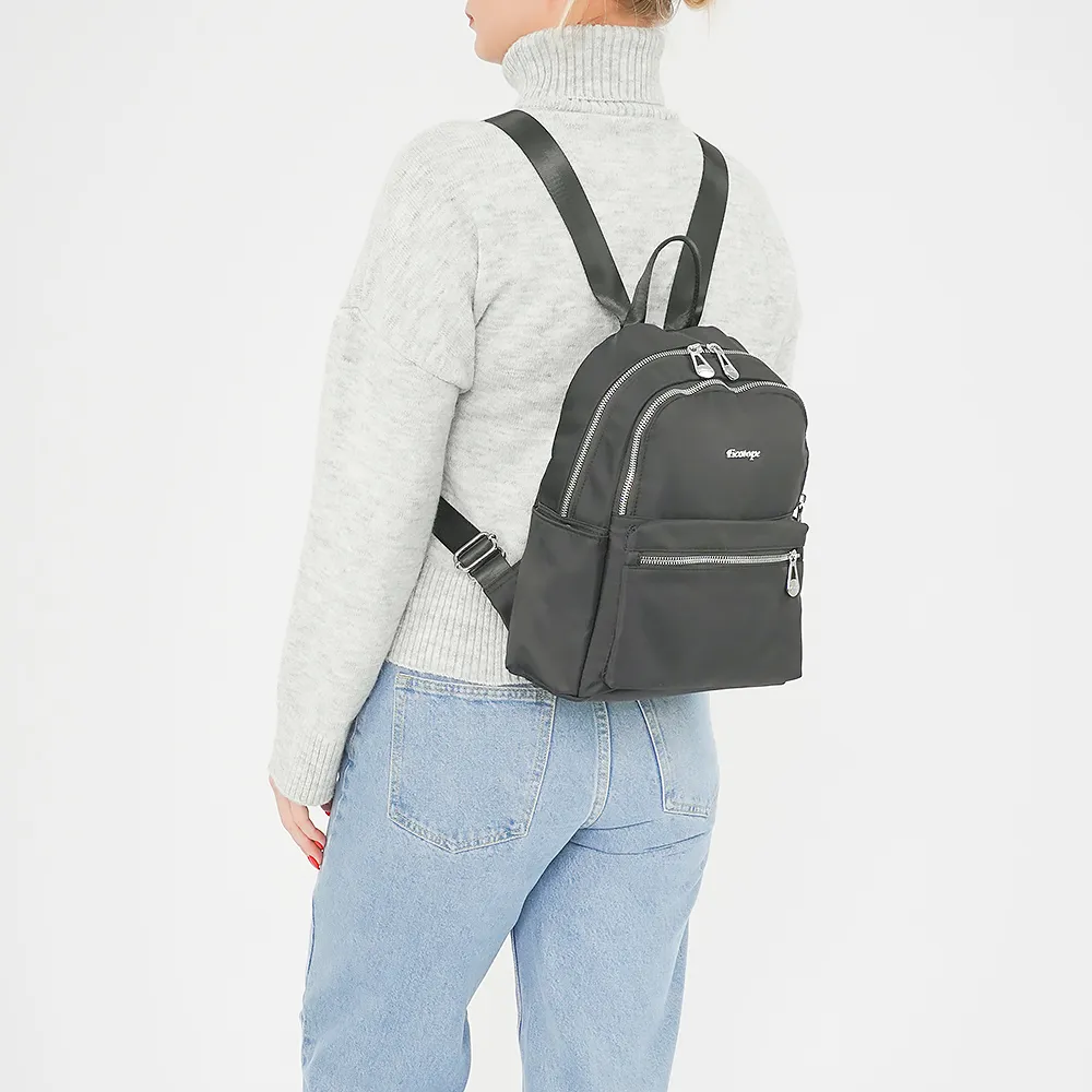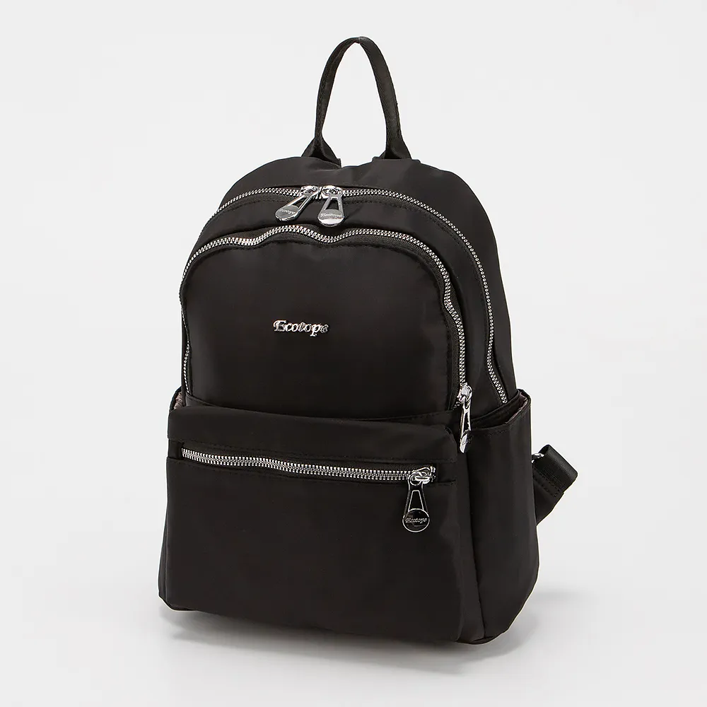 Женский рюкзак от Ecotope выполнен из текстильного материала черного цвета. Снаружи имеет боковые кармашки, два накладных кармана на молнии спереди. Основное отделение на молнии, есть петелька для переноса, плечевые лямки с регулировкой длины, на «спинке» дополнительный карман на молнии.