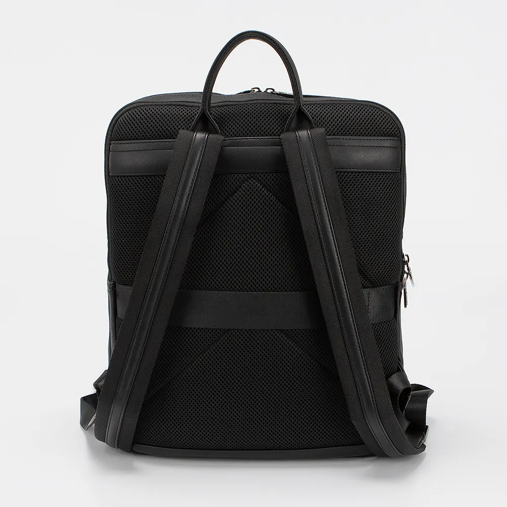 Рюкзак от торговой марки David Jones из искусственной кожи черного цвета. Модель с плотной лямкой и регулируемыми плечевыми лямками, выполненными в комбинации кожи и текстильного материала. Два отделения на молнии с фирменной подкладкой. В основном - карман на молнии, накладной карман. На лицевой стороне два кармана на молнии. На спинке имеется лямка для крепления на выдвижную ручку чемодана.