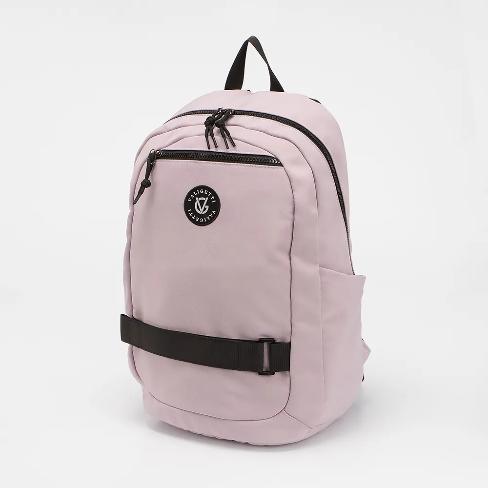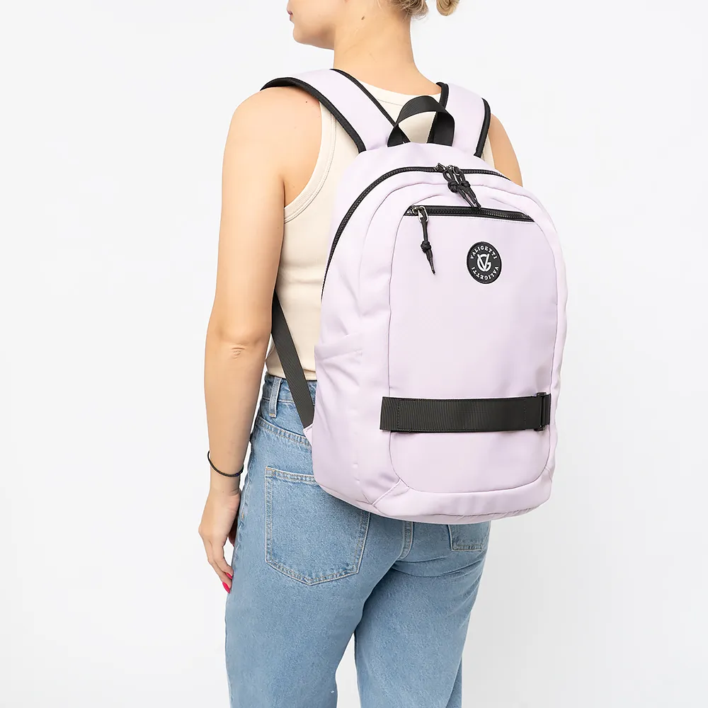 Рюкзак от торговой марки Valigetti из текстильного материала сиреневого цвета. Модель с лямкой и регулируемыми плечевыми ремнями, дополнительно фиксирующимися на груди ремнями с застежкой фастекс. Отделение на молнии. На лицевой стороне - карман на молнии. По бокам карманы без застежек. На задней стороне - лямка для крепления на ручку чемодана.