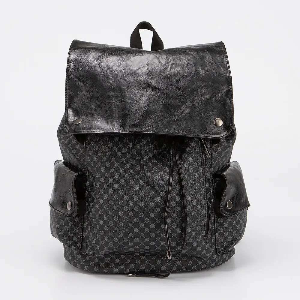 Рюкзак от торговой марки Ecotope из текстильного материала черного цвета с принтом в виде орнамента, с элементами из искусственной кожи. Модель с лямкой-переноской, регулируемыми плечевыми ремнями. Клапан на кнопках закрывает отделение, стягивающееся шнурками по принципу торбы. Внутри: текстильная подкладка, накладной карман. На лицевой стороне - вертикальный карман на молнии. По бокам - накладной карман с клапаном.