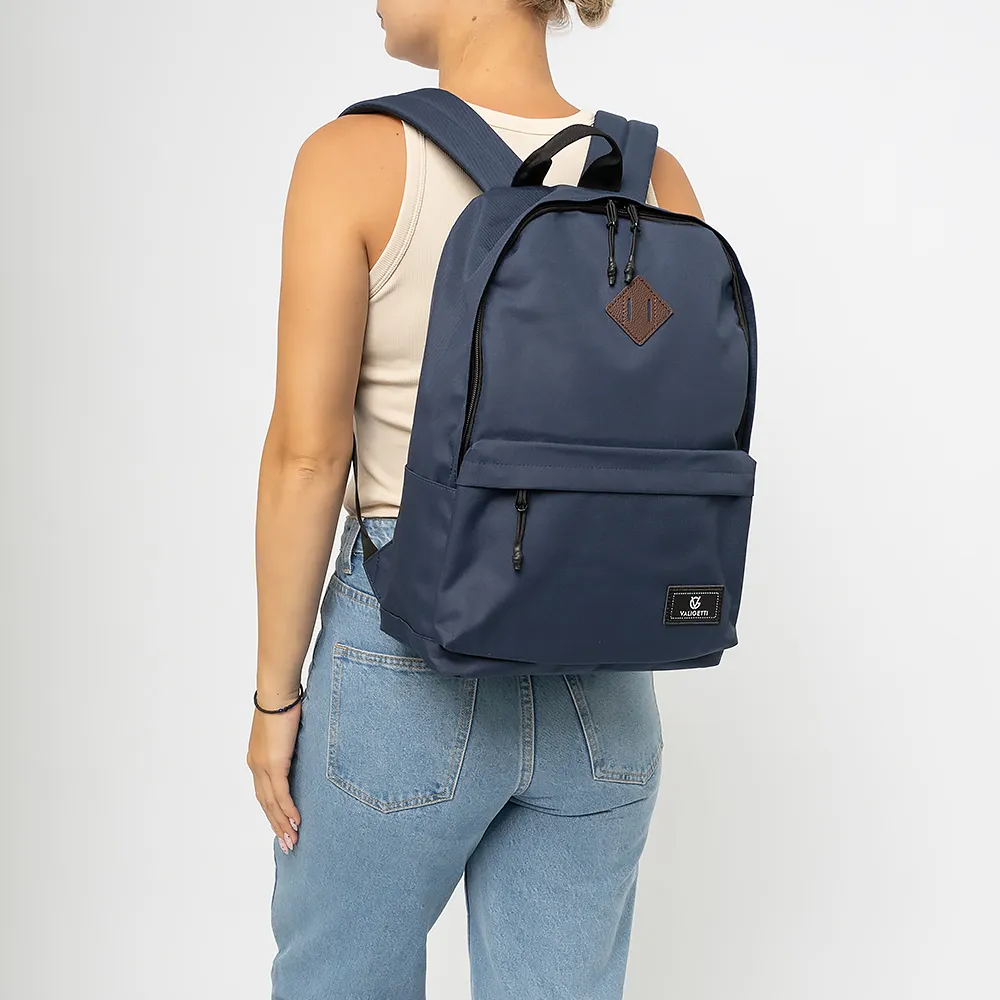 Рюкзак от торговой марки Valigetti из текстильного материала синего цвета. Модель с лямкой для переноски и регулируемыми плечевыми ремнями. Отделение на молнии. Внутри: текстильная подкладка, карман для ноутбука, карман на молнии. На лицевой стороне - карман на молнии. По бокам карманы без застежек. На задней стороне - вертикальный карман на молнии.