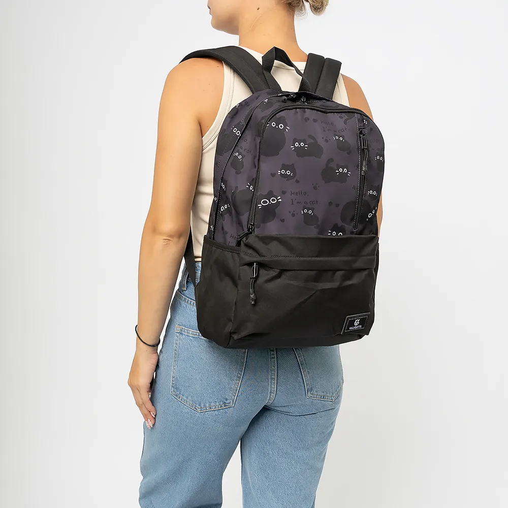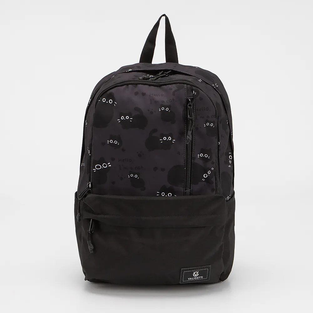 Рюкзак от торговой марки Valigetti из текстильного материала черного цвета с изображением кошачьих глаз. Модель с лямкой для переноски и регулируемыми плечевыми ремнями. Два отделения на молнии. Внутри: текстильная подкладка, карман для ноутбука, карман на молнии. На лицевой стороне - два кармана на молнии. По бокам карманы без застежек. На задней стороне - вертикальный карман на молнии.