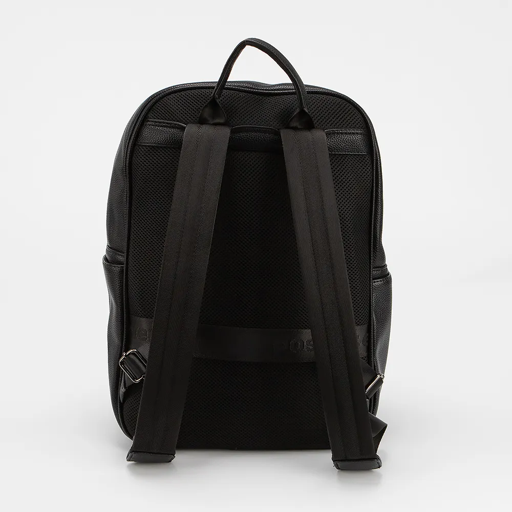 Рюкзак от торговой марки Poshete выполнен из искусственной кожи черного цвета. Модель с лямкой для переноски и регулируемыми плечевыми ремнями. Отделение на молнии со встречными бегунками. Внутри: текстильная подкладка. На лицевой стороне - объемный карман на молнии и накладной карман. По бокам - карманы без застежки.