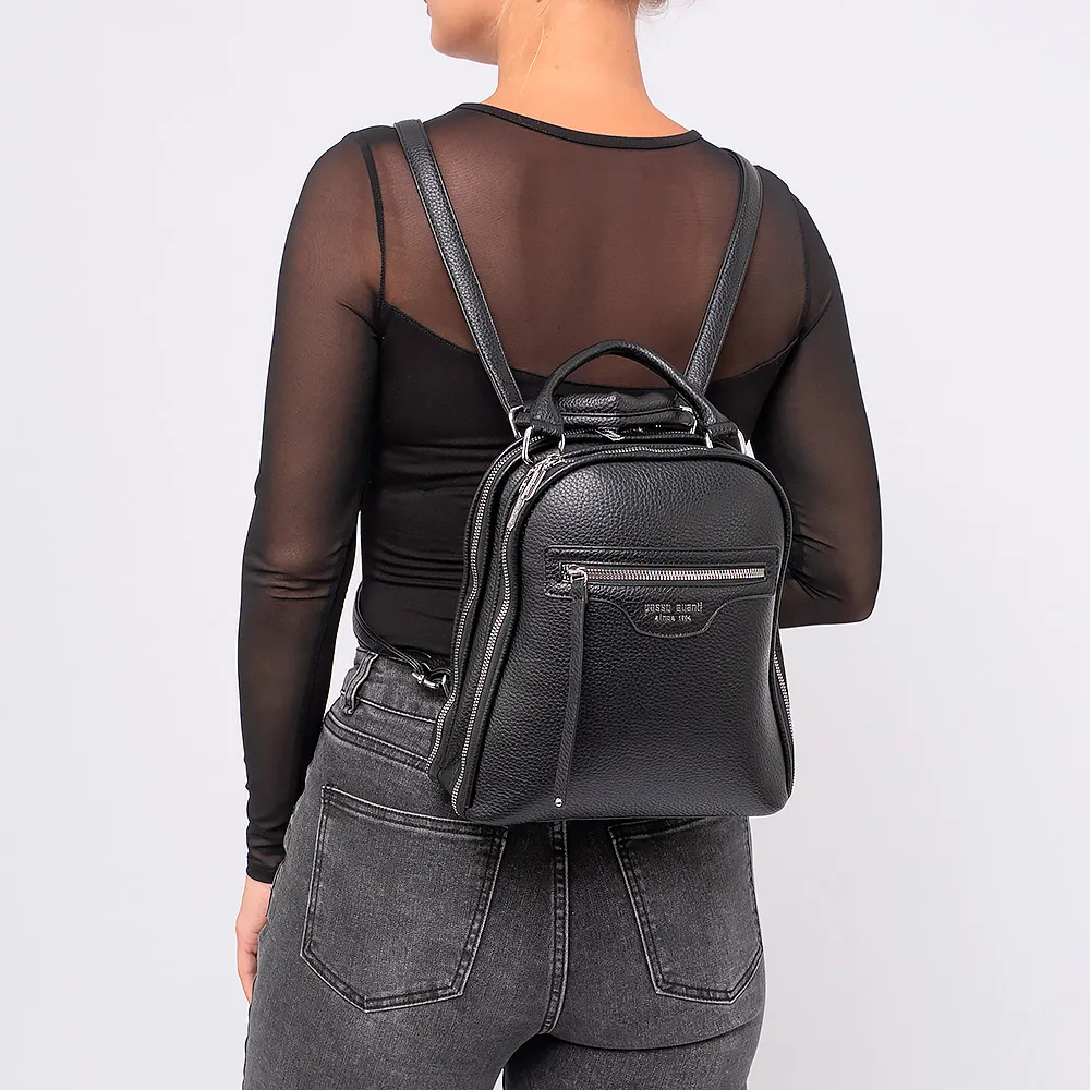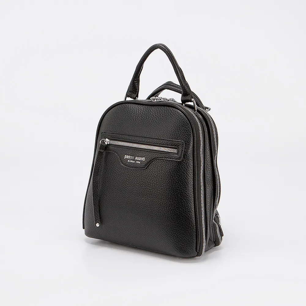 Сумка-рюкзак от торговой марки Passo Avanti выполнен из искусственной кожи черного цвета. Модель с ручкой для переноски и длинным регулируемым ремнем, который стягивается в плечевые лямки. Два отделения на молнии. Внутри: текстильная подкладка, карман на молнии, накладной карман. На лицевой и задней стороне - карман на молнии.