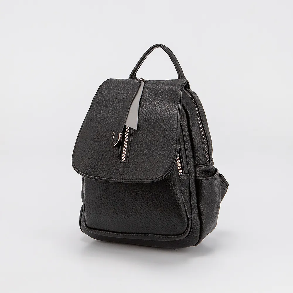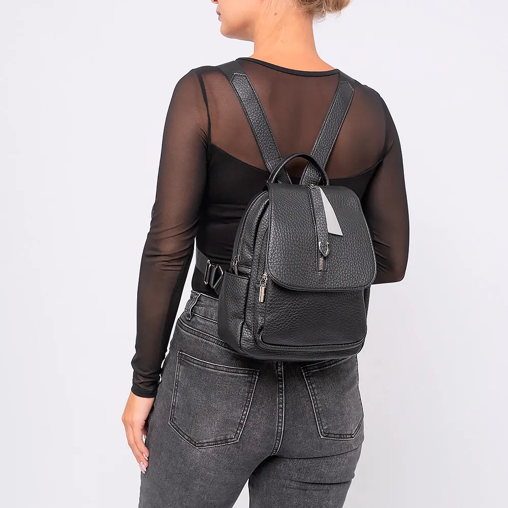 Рюкзак от торговой марки Valigetti выполнен из искусственной кожи черного цвета. Модель с ручкой для переноски и регулируемыми плечевыми ремнями. Клапан на магнитной кнопке закрывает отделение на молнии и карман на молнии. Внутри: текстильная подкладка. По бокам - карманы без застежки. На задней стороне - карман на молнии.