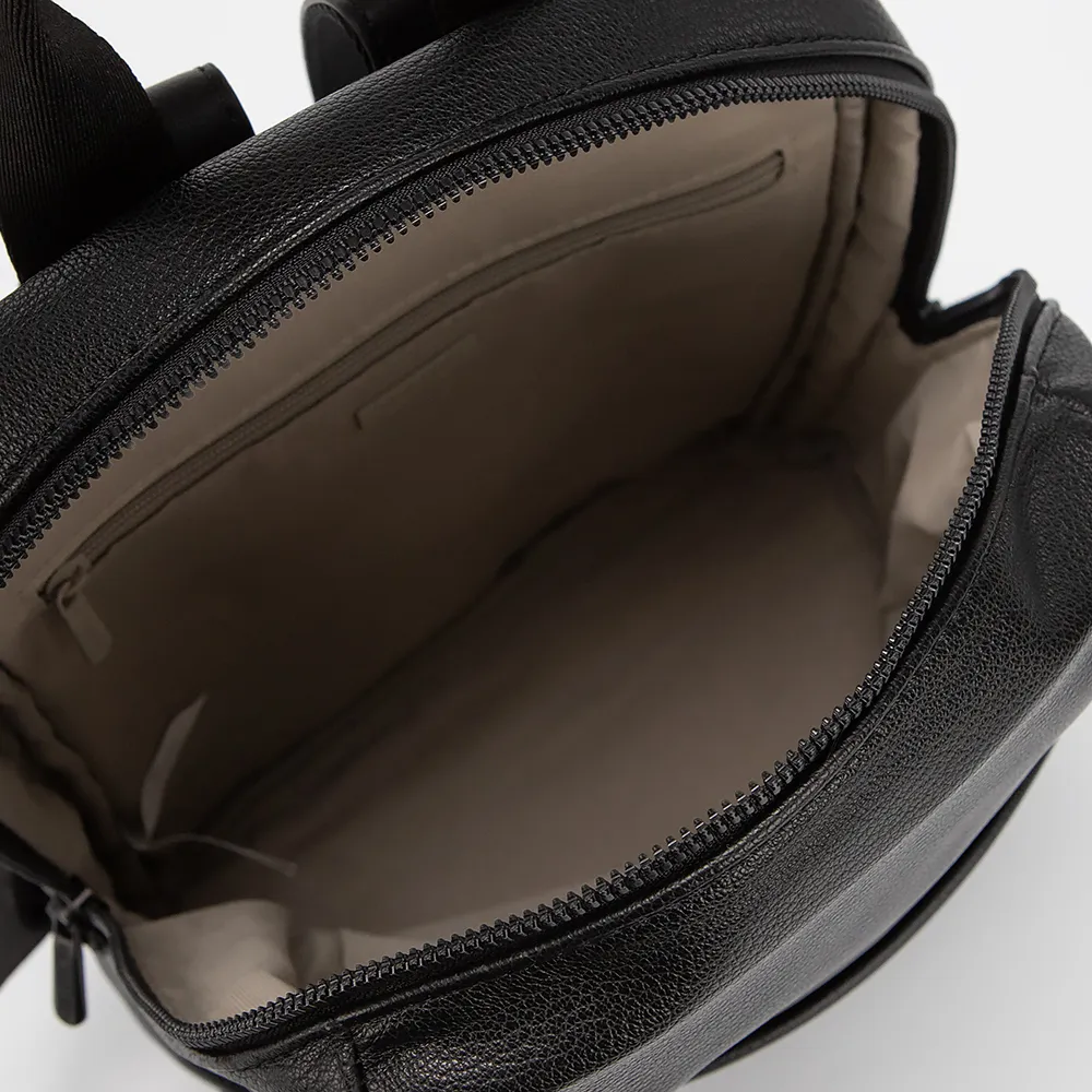 Рюкзак от торговой марки David Jones выполнен из искусственной кожи черного цвета. Модель с ручкой и регулируемыми плечевыми ремнями. Отделение на молнии. Внутри: текстильная подкладка, карман на молнии, накладной карман. На лицевой и задней стороне - карман на молнии.